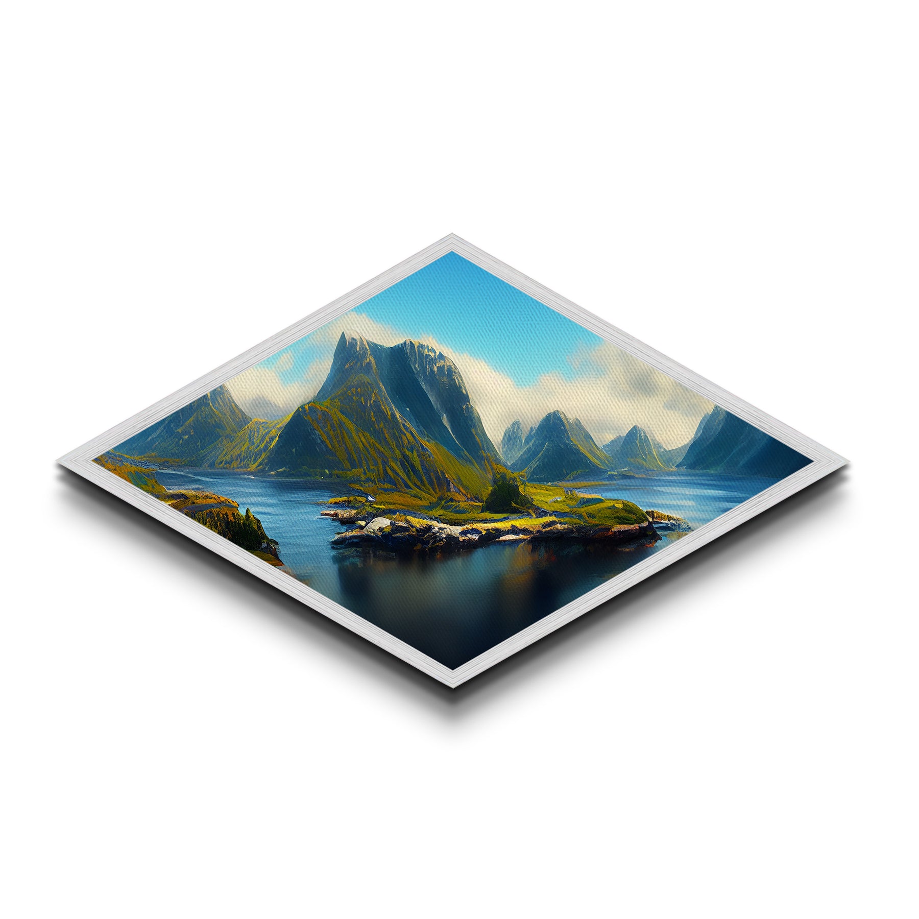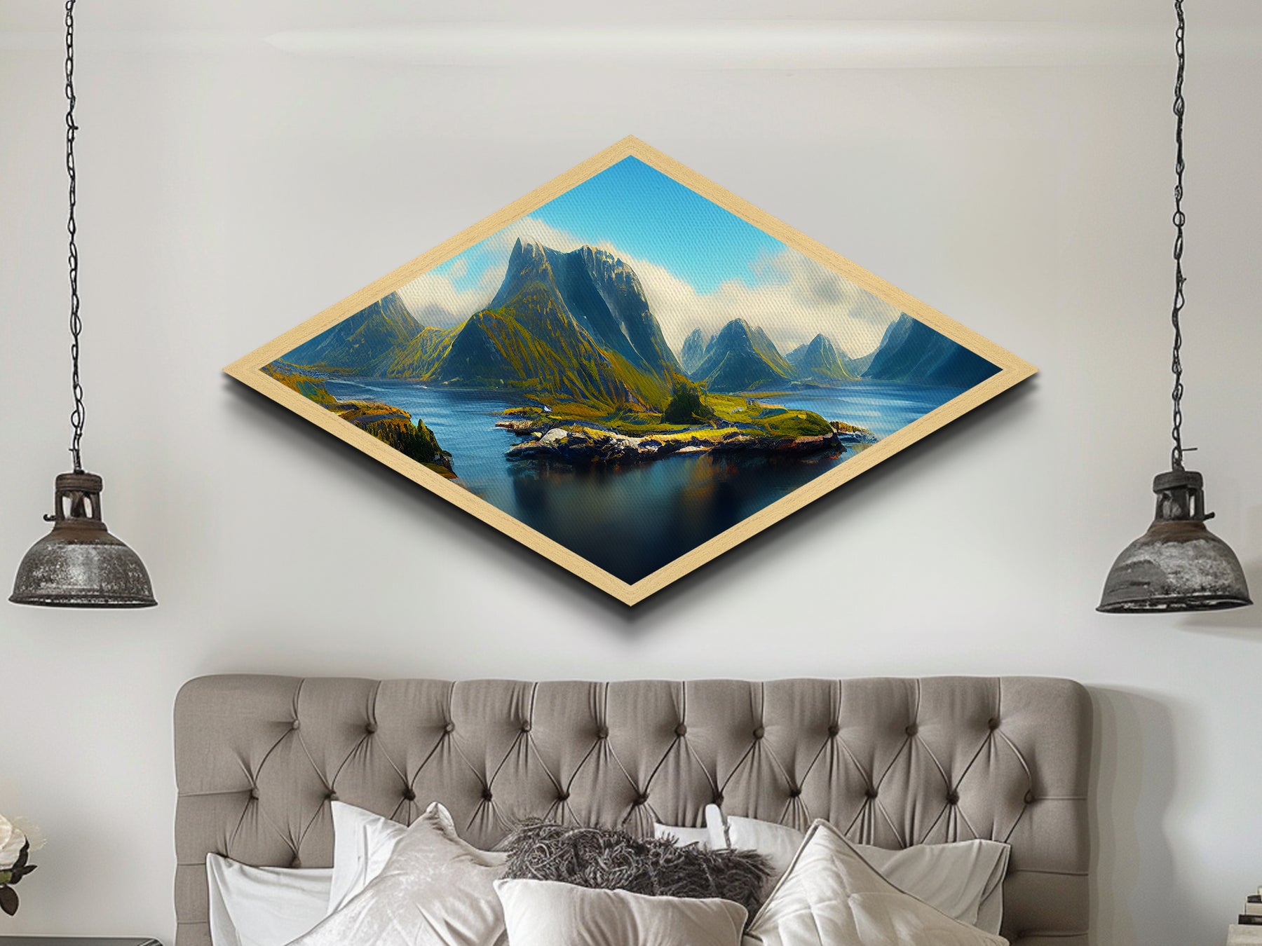 Nordic Fjord Serenity Diamond Shaped Canvas Textured Print, Scandinavian mountain lake art, dramatic nature wilderness wall decor