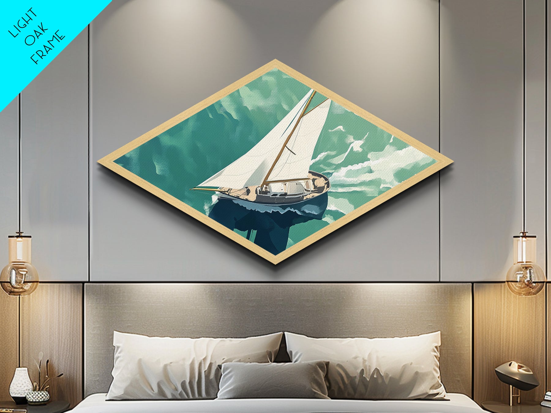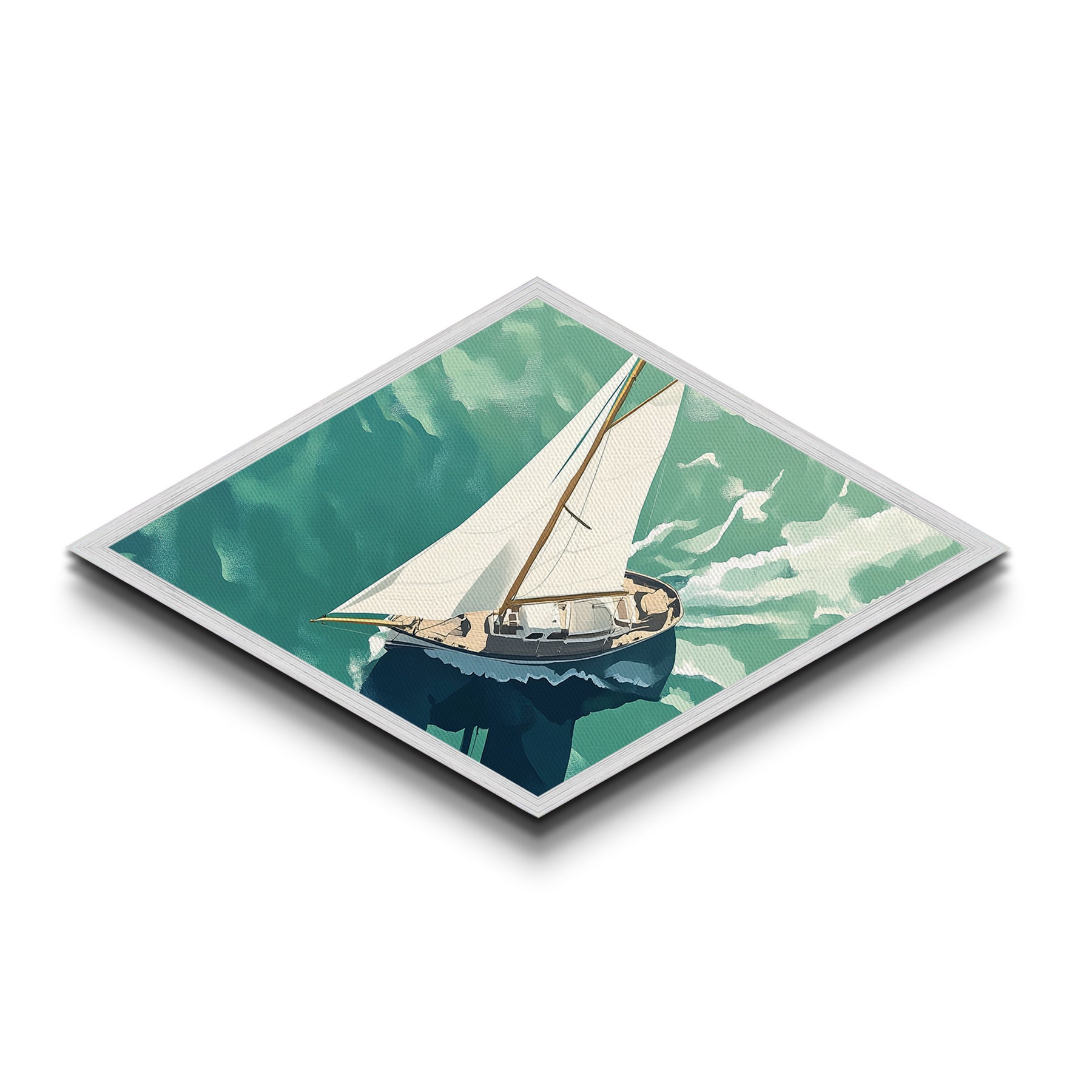 Serene Sailing Calm Diamond Shaped Canvas Textured Print illustrated boat over green sea minimalist marine design tranquil beach house vibe