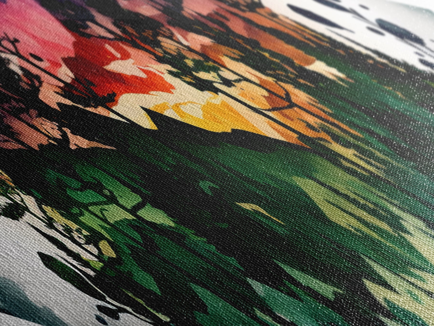 Vibrant Forest Silhouette – Diamond Shaped Mountain Sunset Canvas Textured Print, Abstract Nature Landscape Wall Art