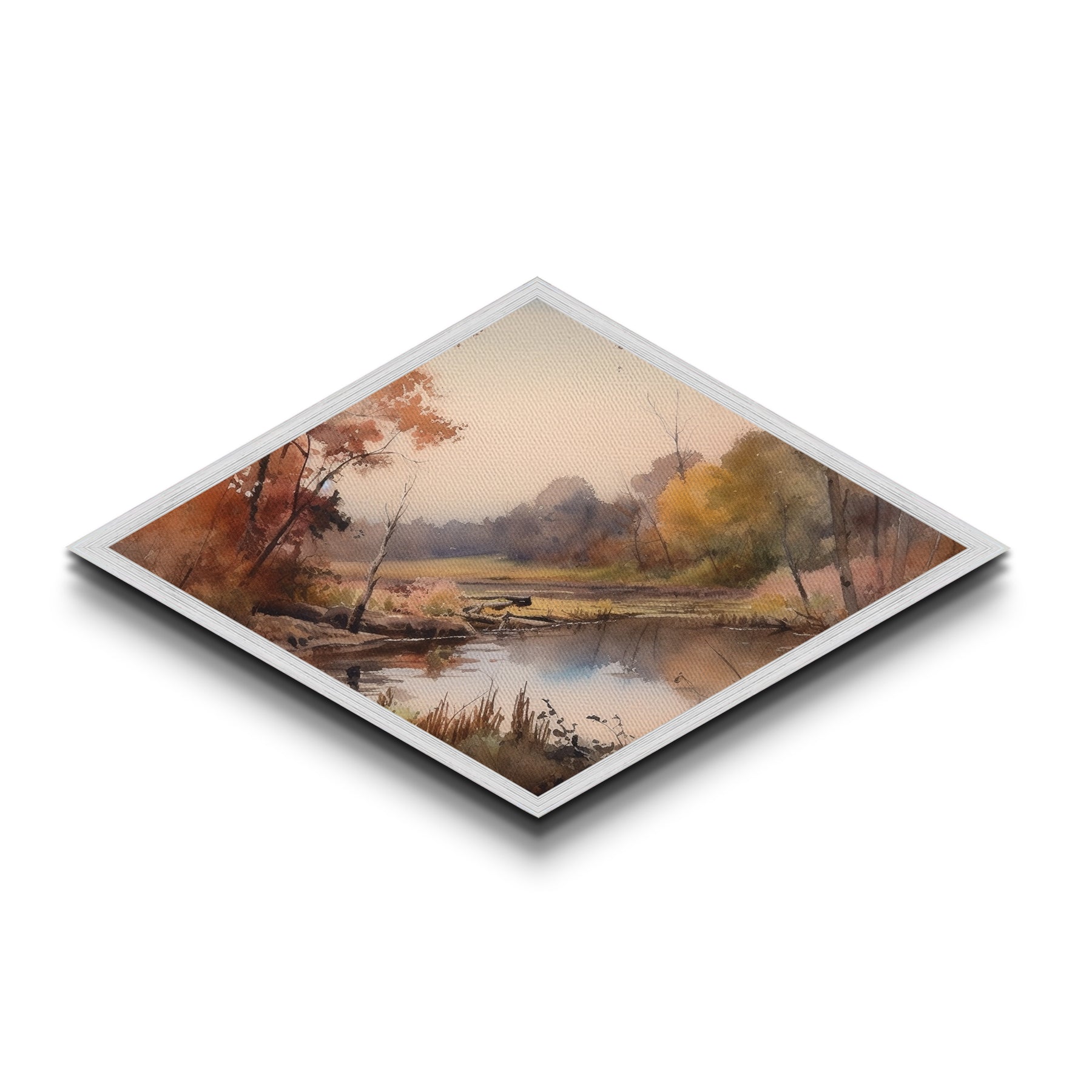 Woodland Reflections – Diamond Shaped Canvas Textured Print, Fall Forest Art, Water Scene Accent, Cozy Home Nature Wall Decor