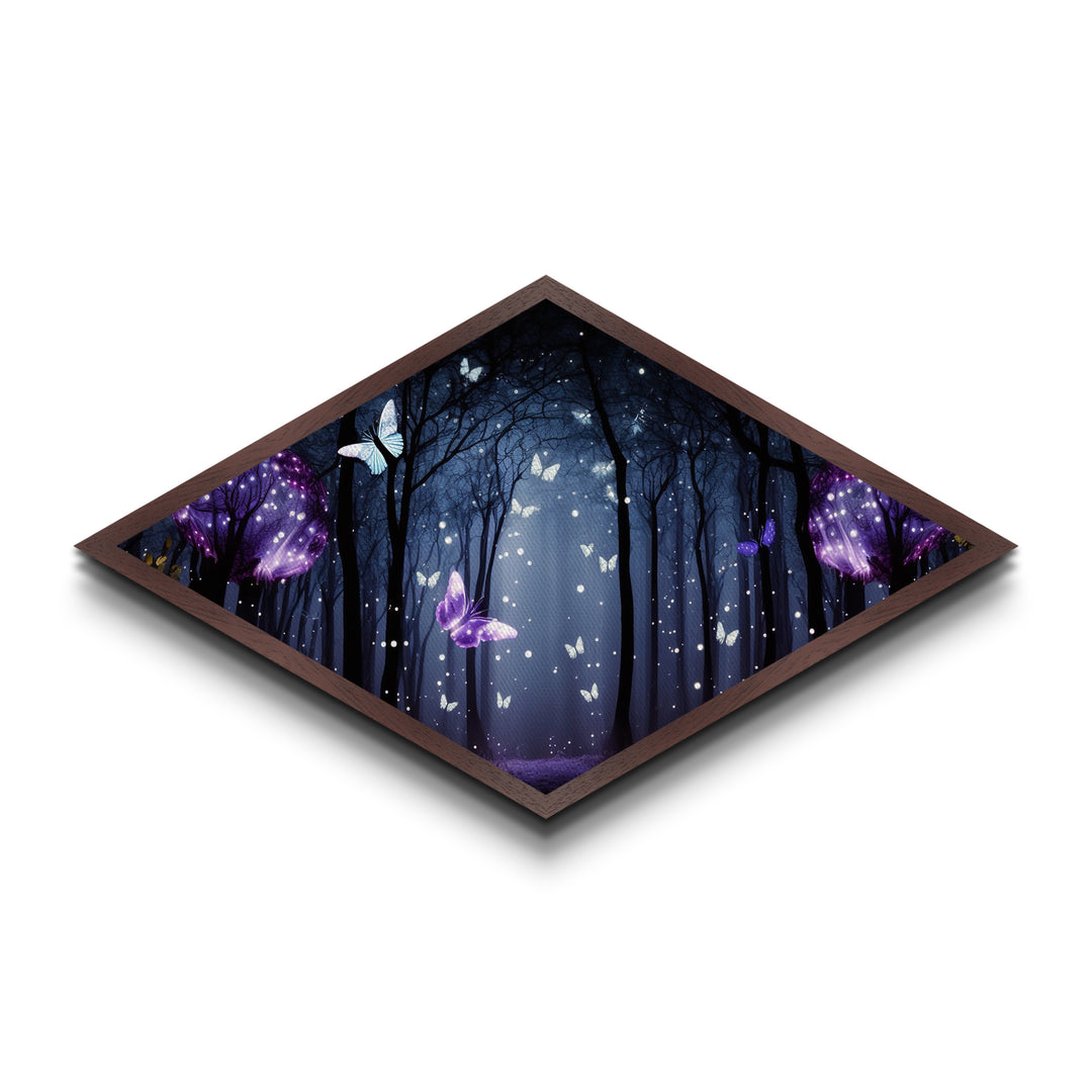 Enchanted Forest Glow – Diamond Shaped Canvas Art Print with glowing butterflies, dreamy purple woodland, fantasy wall decor, nightscape art