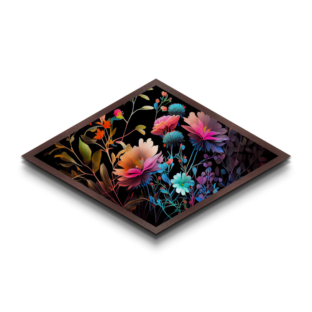 Midnight Bloom Glow Diamond Shaped Canvas Embossed Print with bold floral close-up, colorful petals on black, dramatic flower wall art