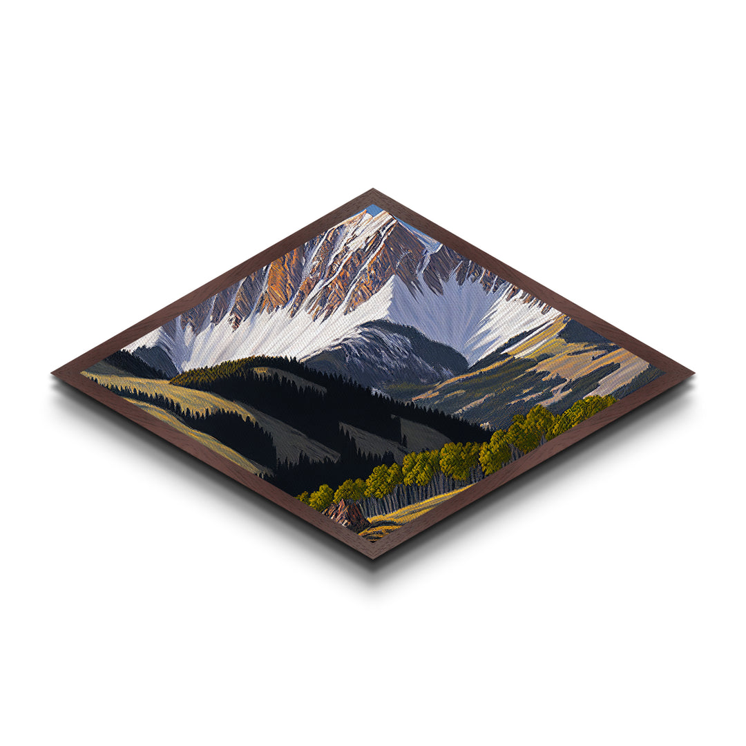 Snowcap Forest Light – Diamond Shaped Canvas Textured Print with alpine mountain landscape, fall forest shadow play, nature inspired home art