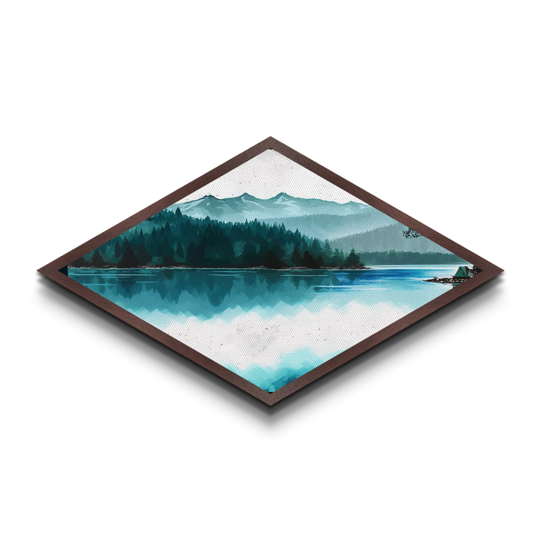 Mountain Lake Reflection – Diamond Shaped Canvas Art Print with blue alpine serenity, forest camping scene, watercolor outdoor landscape decor