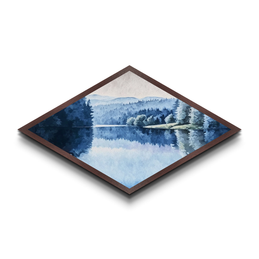 Serene Forest Lake Diamond Shaped Canvas Art Print with misty mountain landscape, nature reflection wall decor, calming watercolor art
