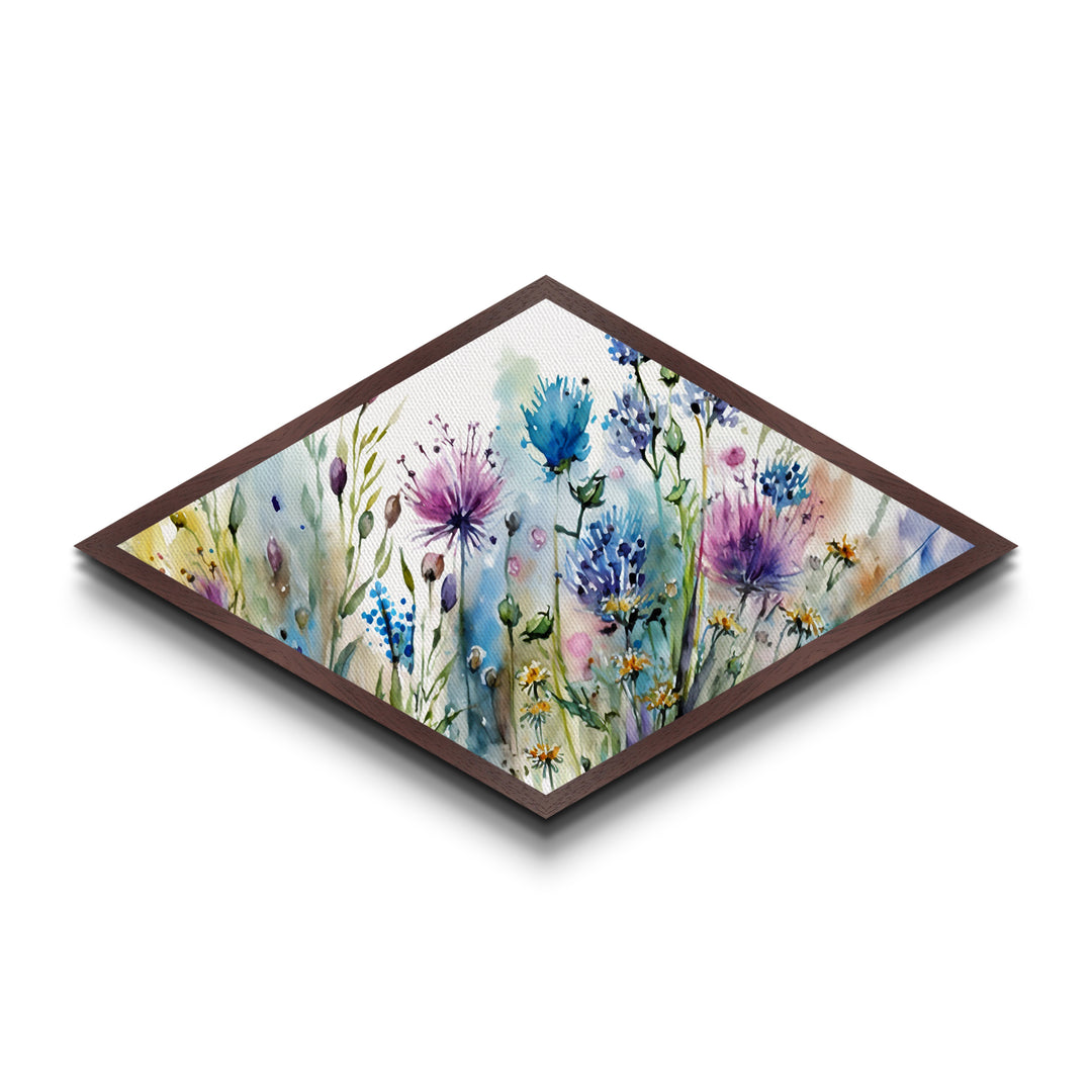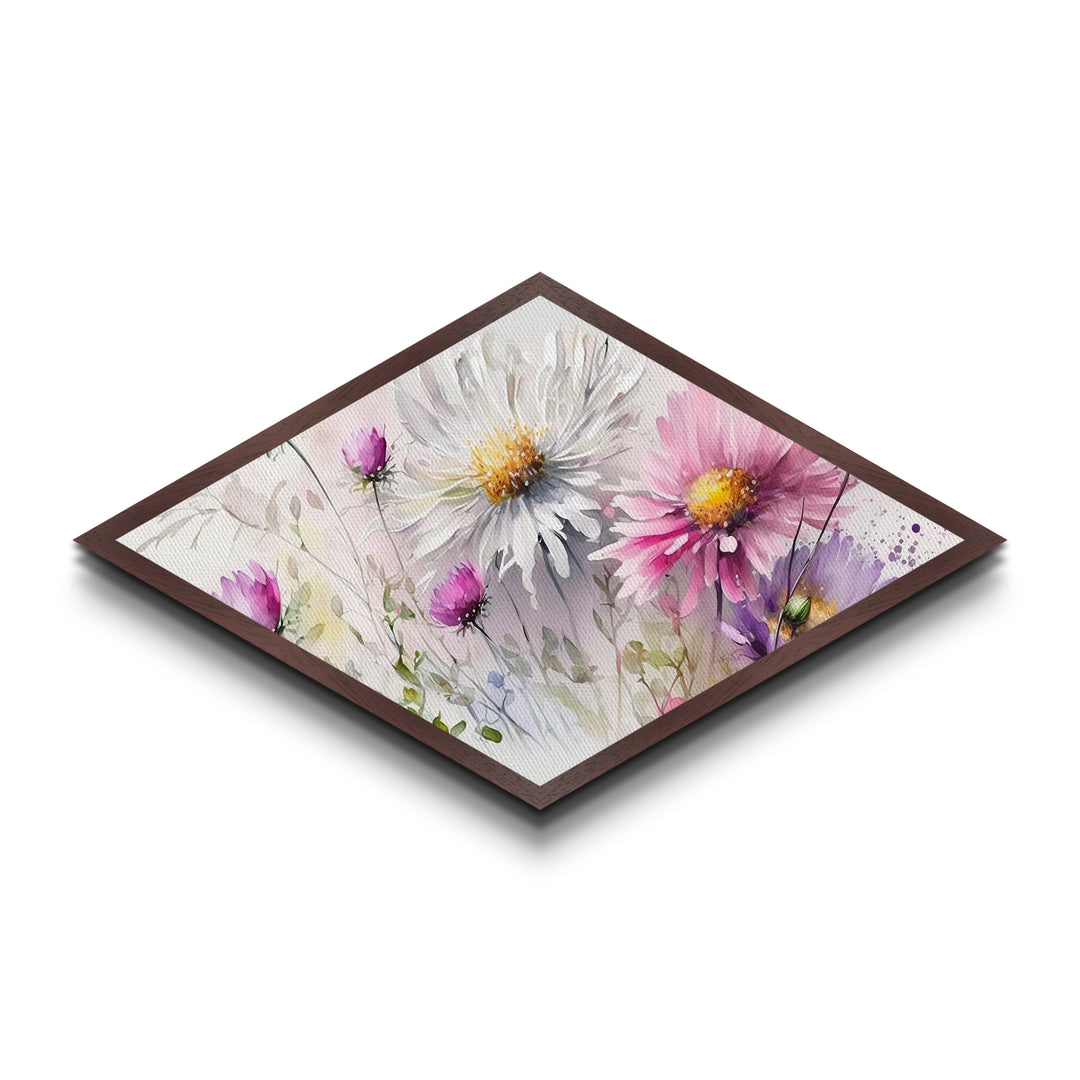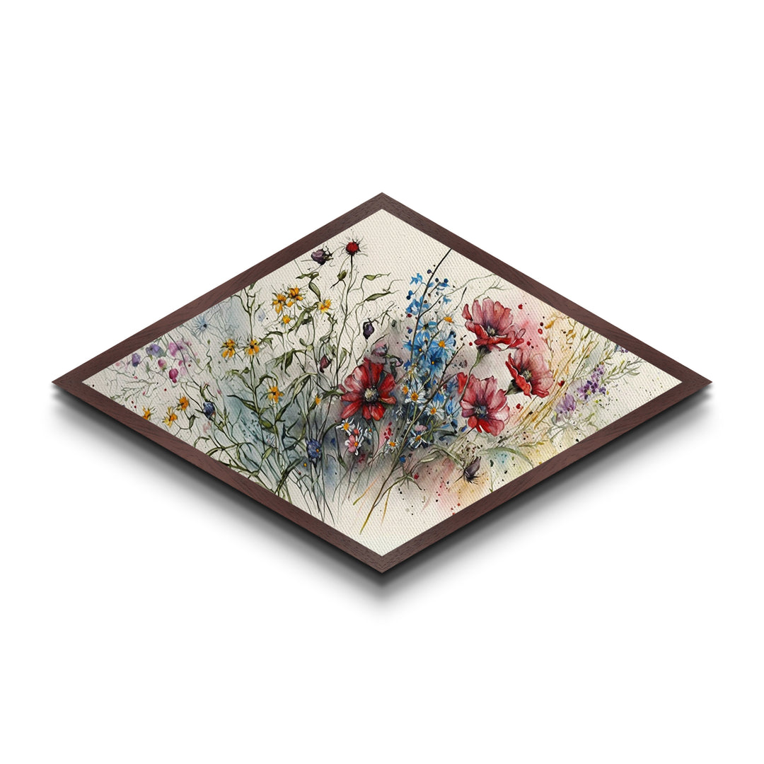 Spring Garden Splash – Diamond Shaped Canvas Textured Print with bright wildflowers, watercolor floral artwork, vibrant botanical decor