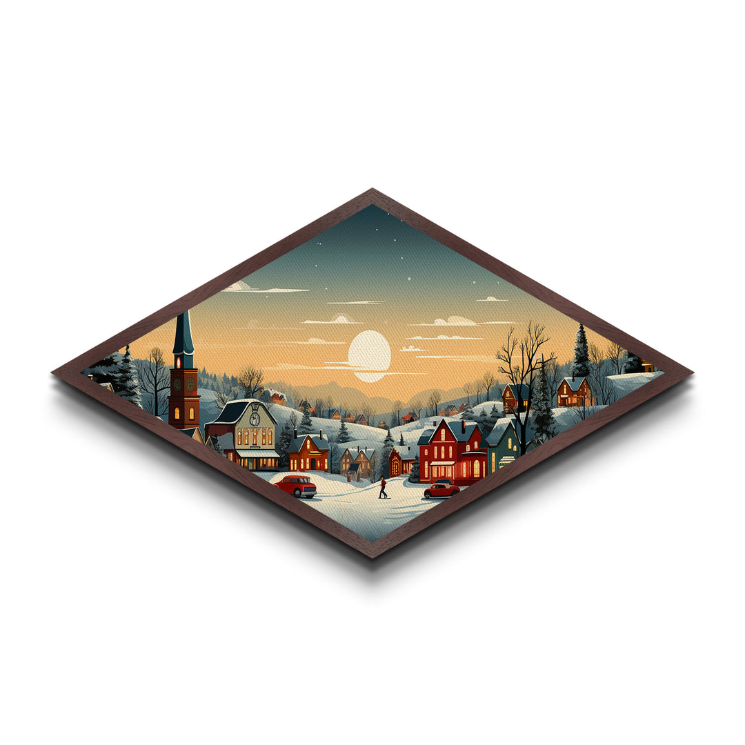 Moonlit Holiday Town Diamond Shaped Canvas Textured Print Christmas landscape art rustic winter cabin decor cozy festive wall gift