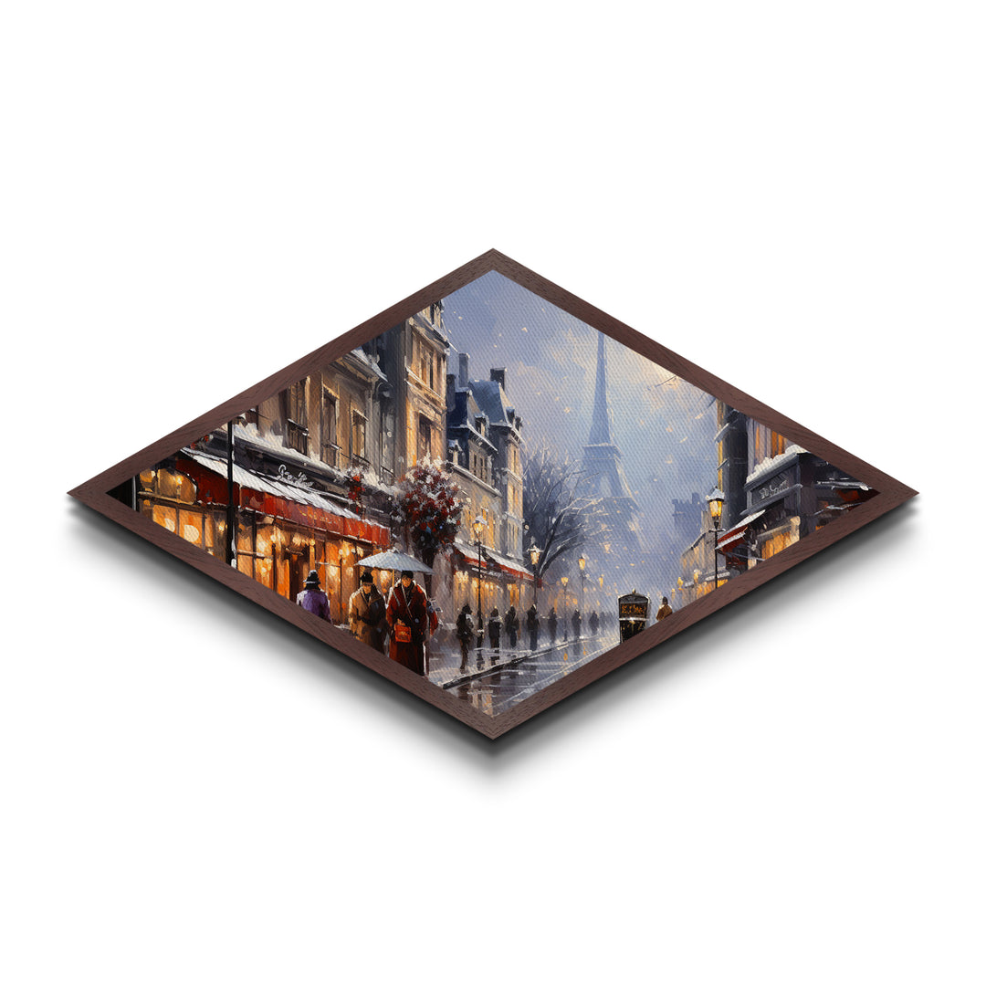Paris Winter Scene Diamond Shaped Canvas Art Print holiday snowy cityscape decor romantic French Christmas wall accent collector