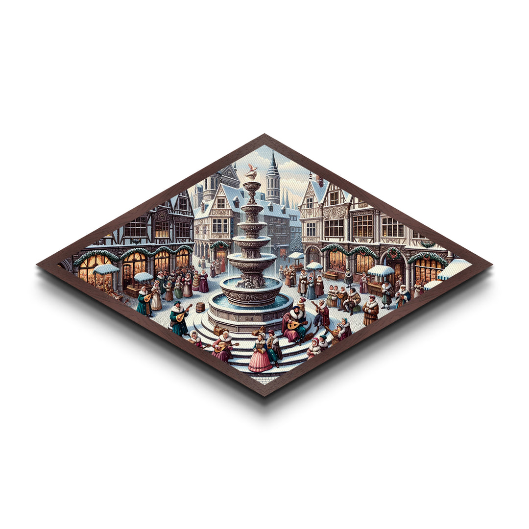 Carolers Fountain Charm Diamond Shaped Canvas Textured Print Victorian holiday village snow season Christmas gift classic wall art