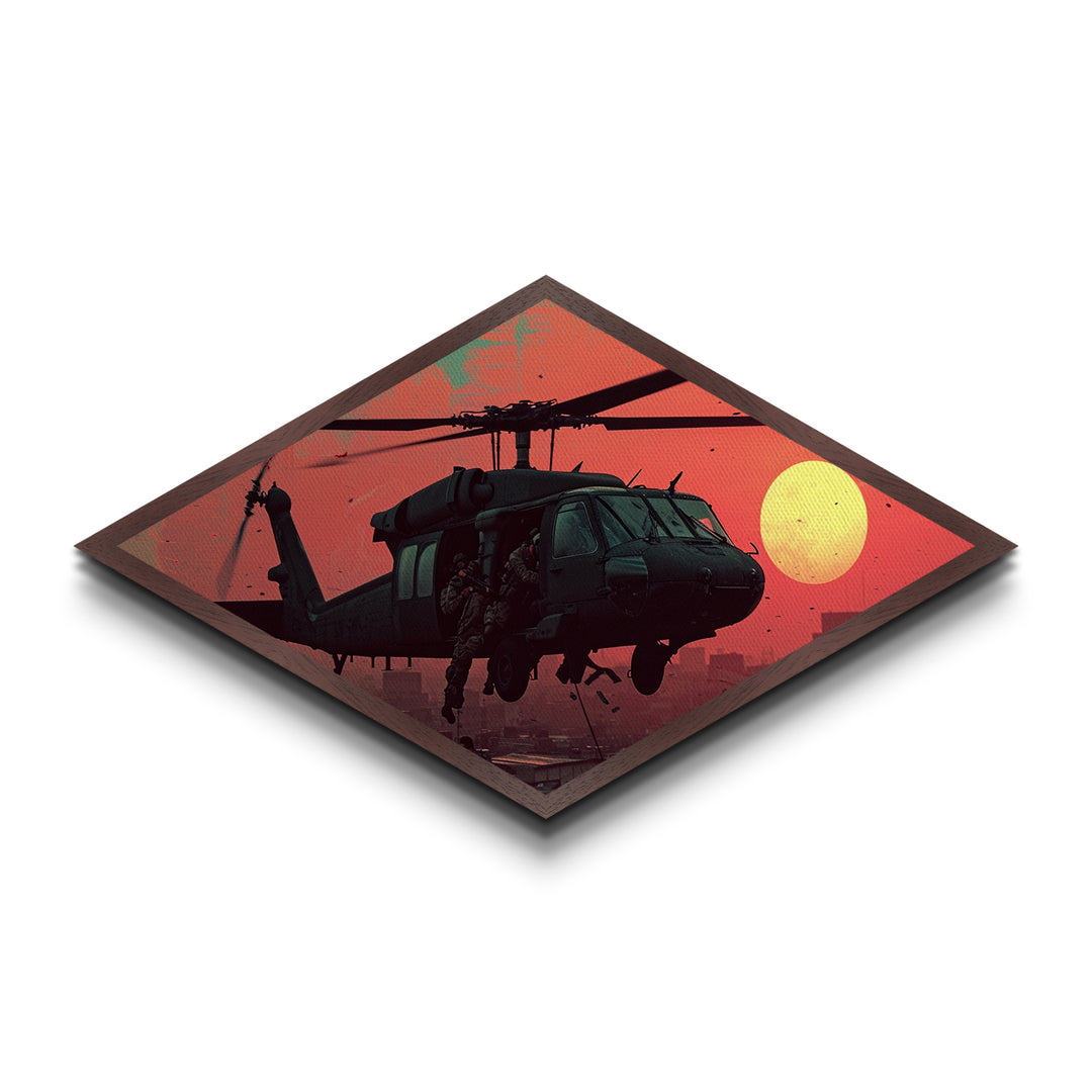 Urban Extraction Sunset — Diamond Shaped Canvas Art Print tactical military wall decor, Black Hawk gift, moody war scene home accent