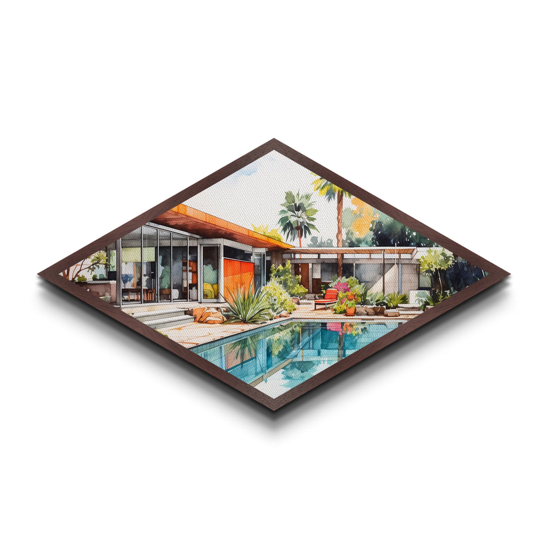 Midcentury Oasis Retreat Diamond Shaped Modern Home Canvas Art Print poolside bungalow retro palm springs architectural wall decor