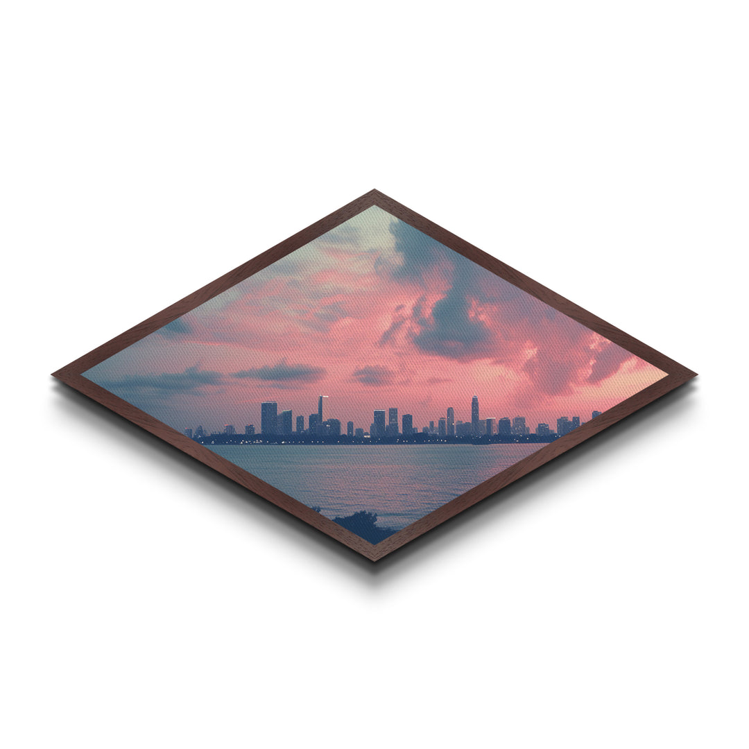 City Sunset Skyline Diamond Shaped modern urban wall decor Canvas Textured Print pink sky art piece ideal living room apartment design