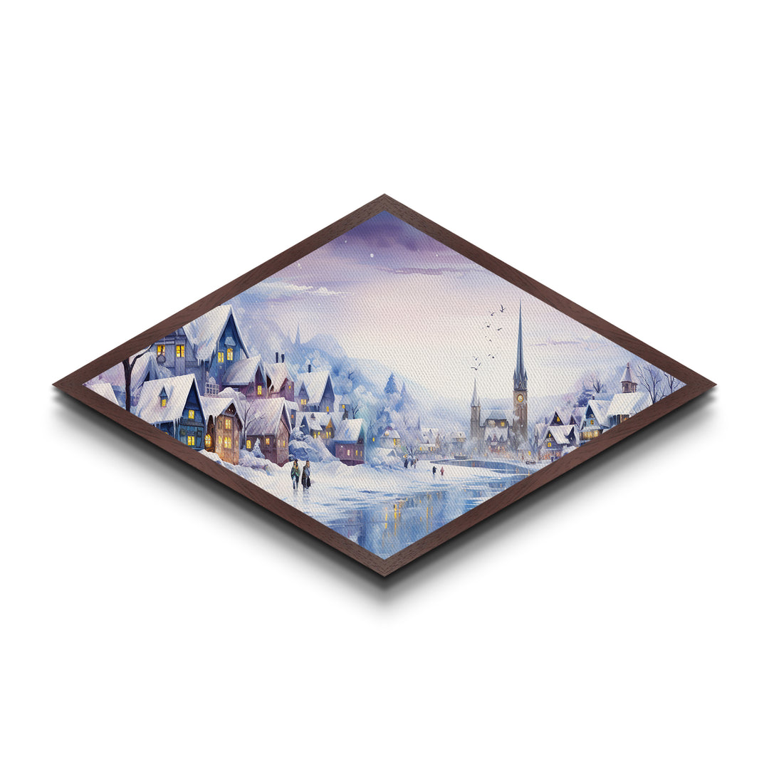 Snowy Village Glow Diamond Shaped Canvas Textured Print winter wonderland art cozy cottage Christmas decor holiday living room charm