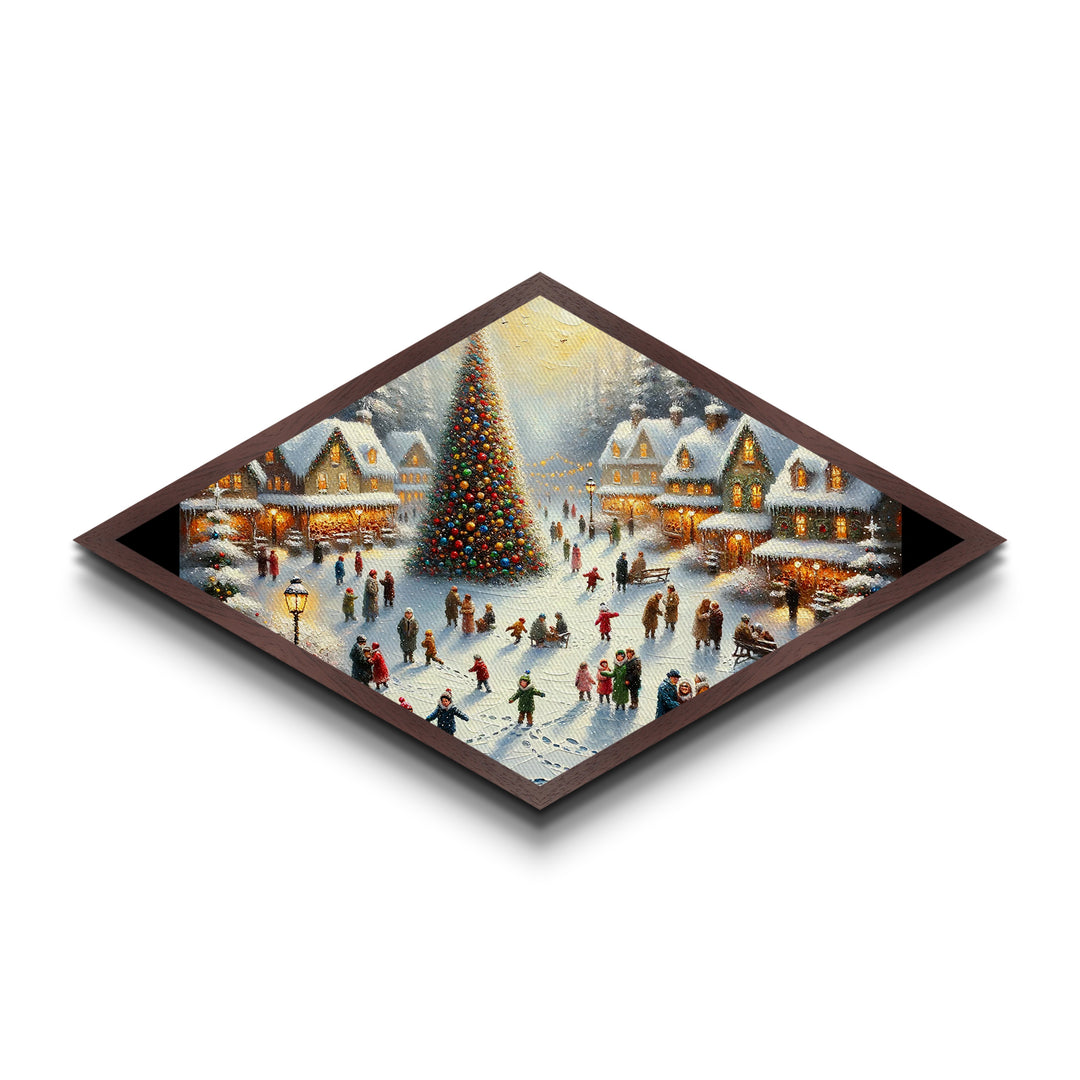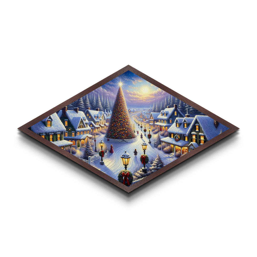 Festive Town Square Diamond Shaped Canvas Embossed Print Christmas tree snowy village nostalgia seasonal living room holiday wall