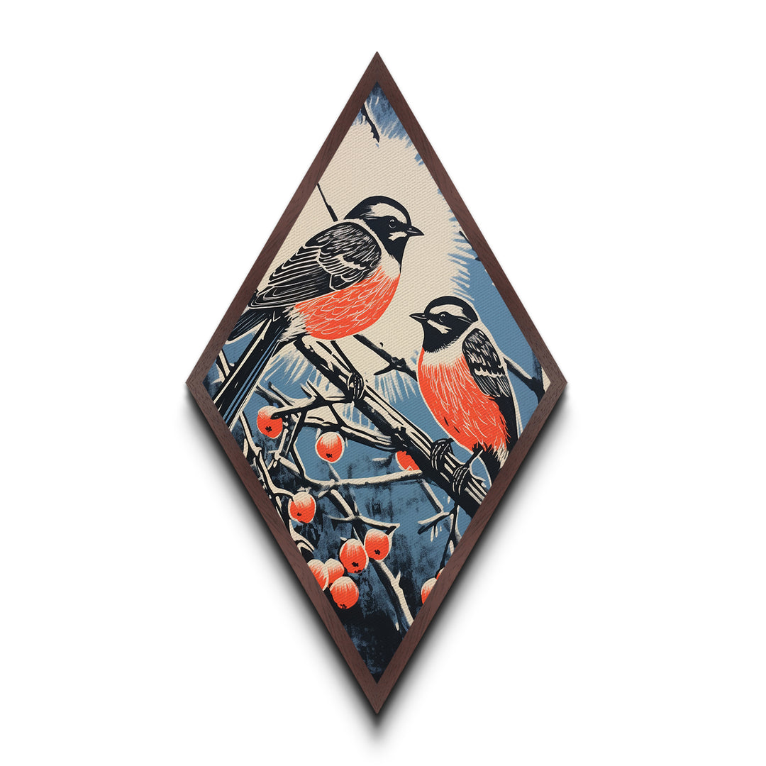 Winter Songbirds – Diamond Shaped Canvas Textured Print Nature Wall Decor, Vintage Bird Illustration, Cottagecore Wildlife Rustic Accent