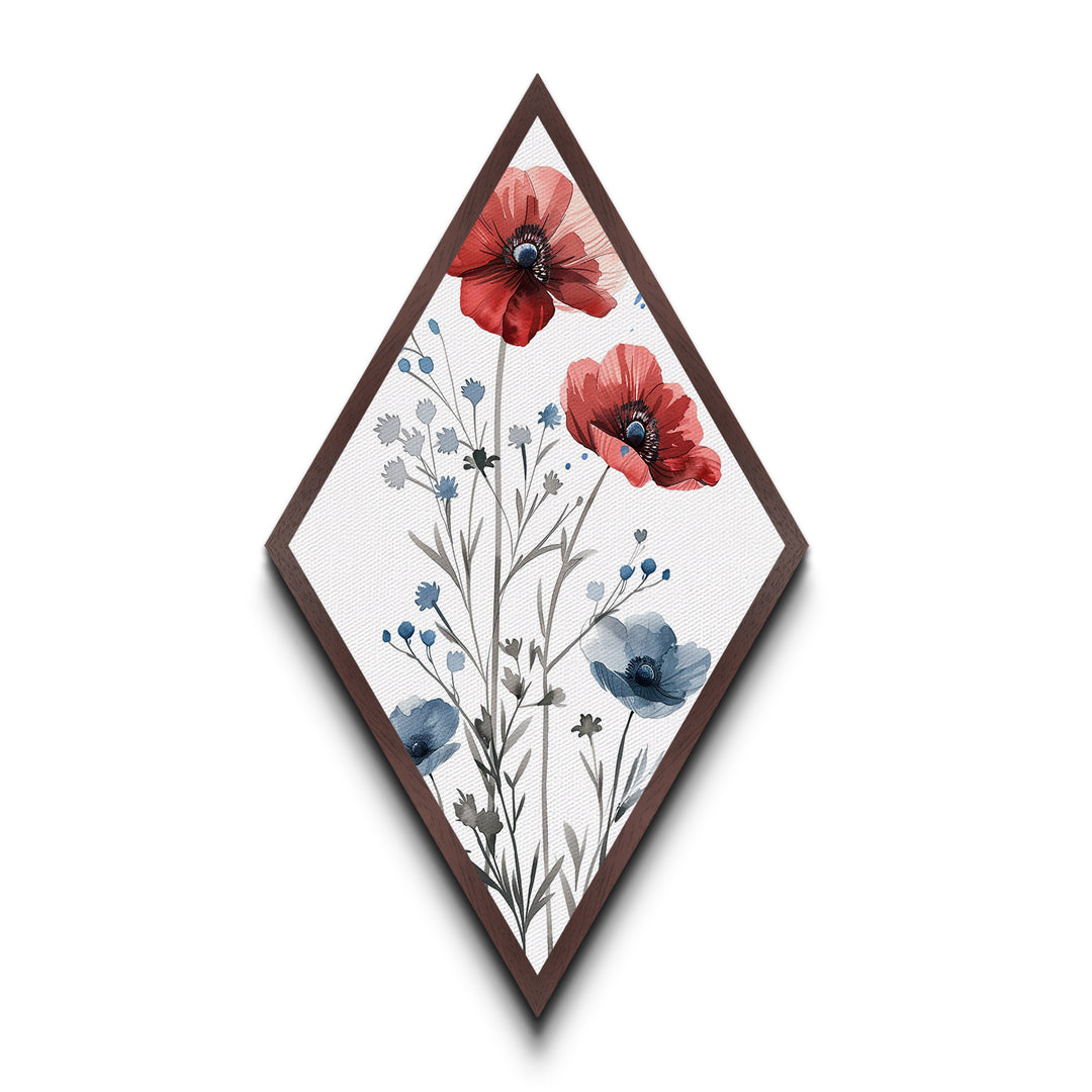 Diamond Shaped Crimson Blue Poppy Arrangement, elegant floral watercolor Canvas Textured Print, boho bloom decor, botanical flower wall art
