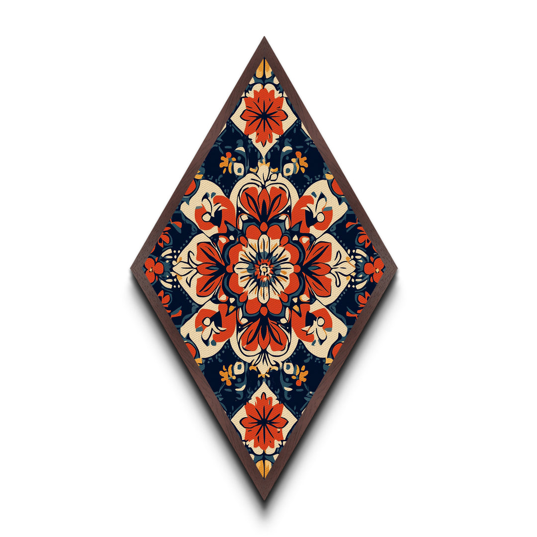 Floral Tile Harmony Diamond Shaped Canvas Art Print with bold folk pattern red navy decorative symmetry boho home accent Mediterranean decor