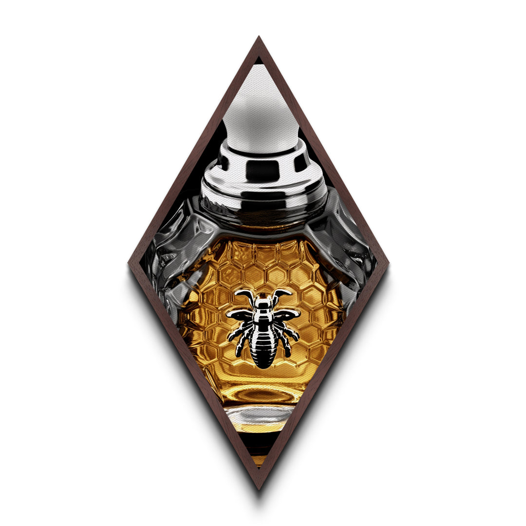 Honeycomb Elegance Bee Diamond Shaped Canvas Art Print, Gold Hexagon Insect Decor, Glam Perfume Bottle Graphic Wall Piece