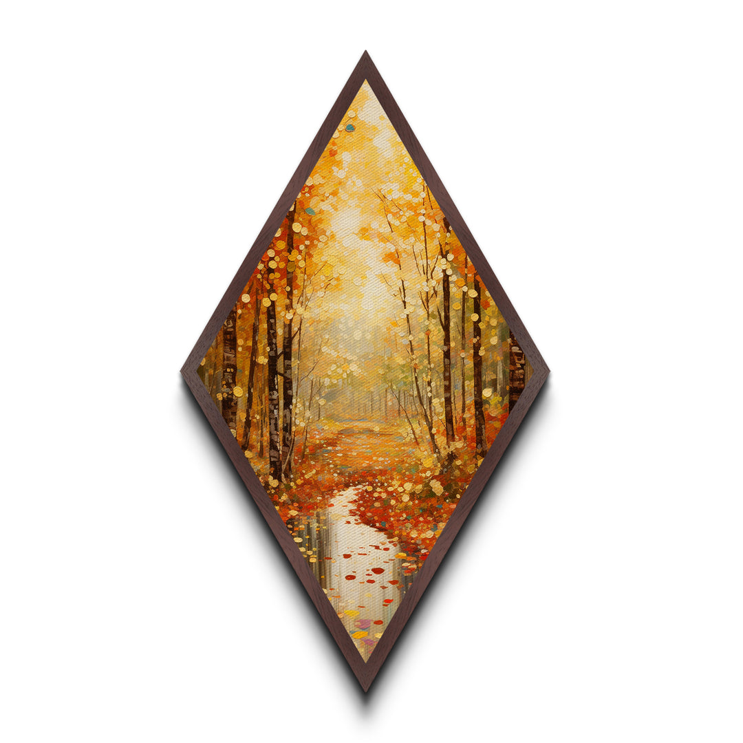 Golden Autumn Trail Diamond Shaped Fall Forest Path Canvas Textured Print Warm Leafy Colors Woodland Walkway Nature Art Decor