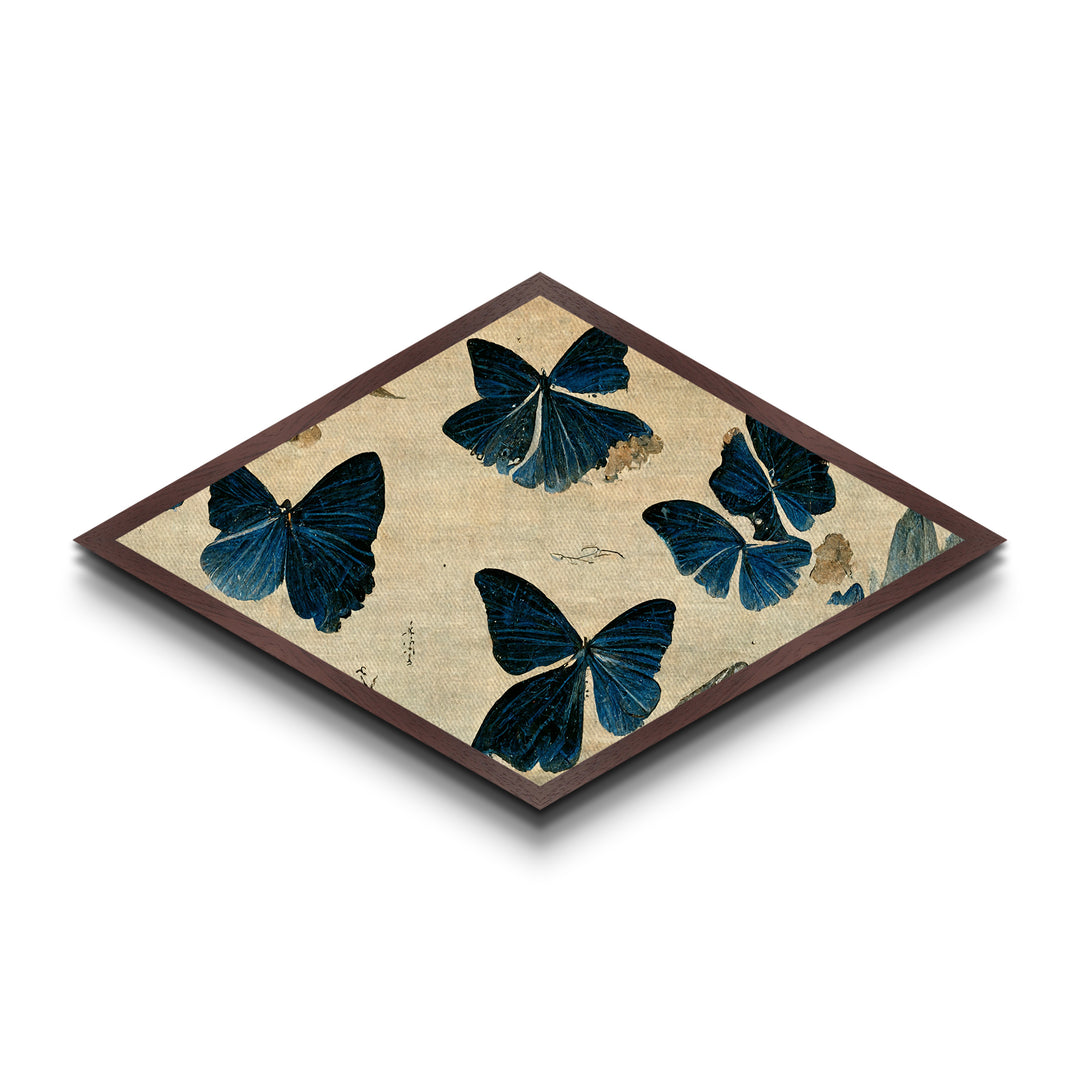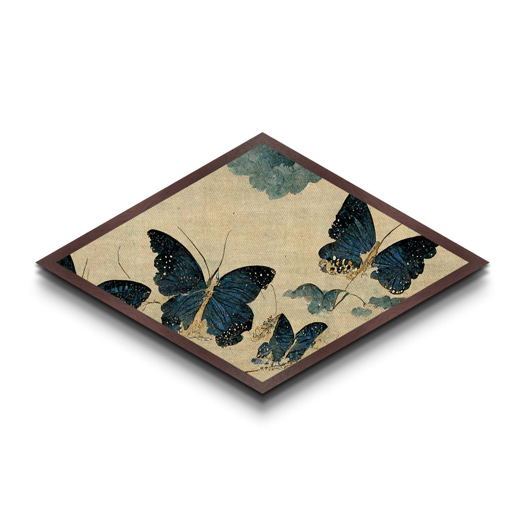 Indigo Butterflies Dance Diamond Shaped Vintage Nature Canvas Embossed Print Japanese Insect Art Botanical Delicate Elegant Decor