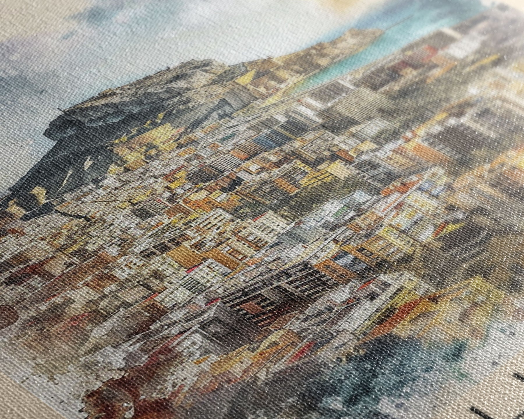 Most of our canvases are made in the USA, with the exception of canvases ordered with the light oak unstained frames, and any large canvases (24x48, 30x60, 16x48 and 20x60) ordered WITH a frame. These are temporarily made in and shipped from Europe, while we try to find a more consistent supplier in the USA.
