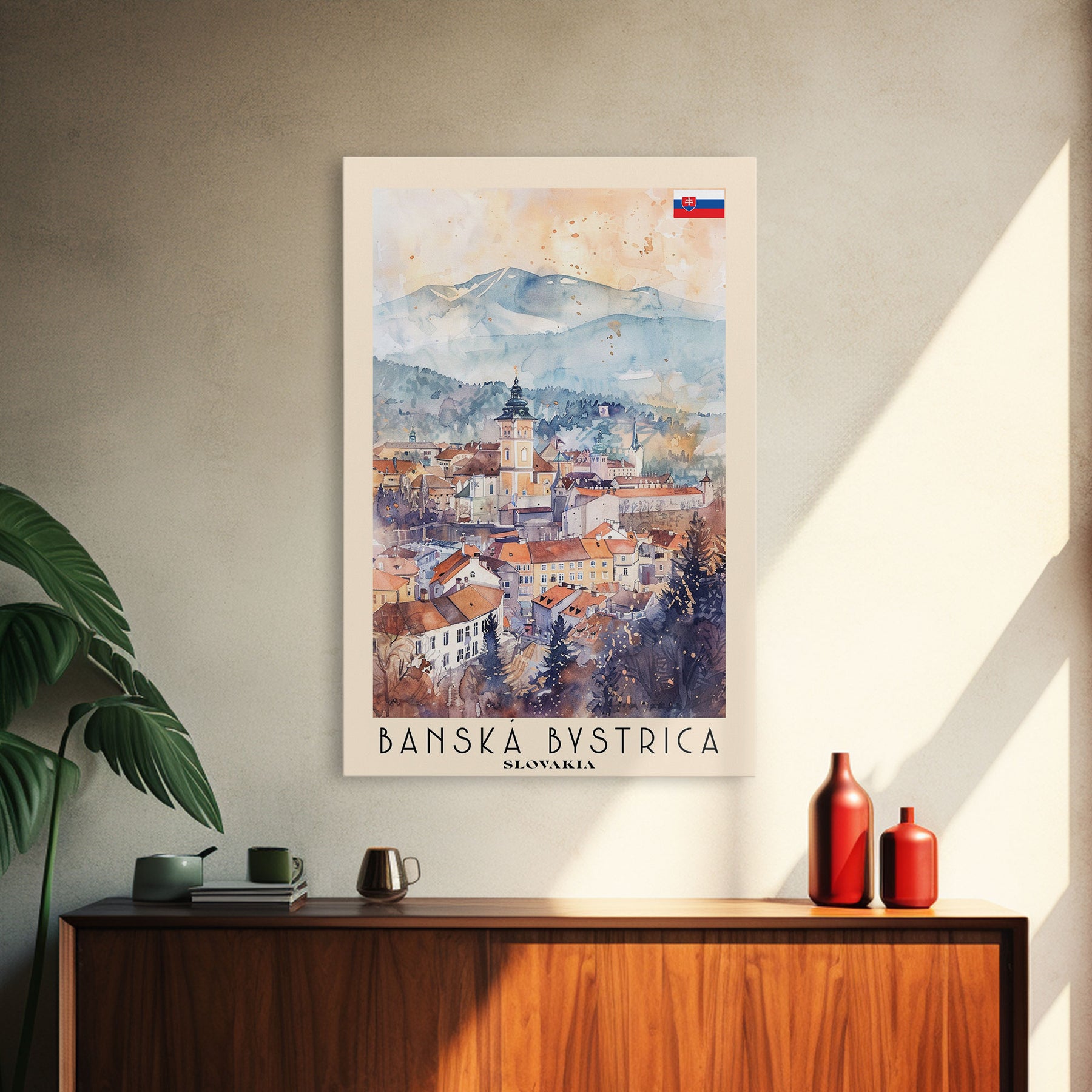 Banska Bystrica Slovakia Travel Poster Framed Canvas Print, Wall Art, Home Decor, Vacation Print, Watercolor Painting, Cityscape Art