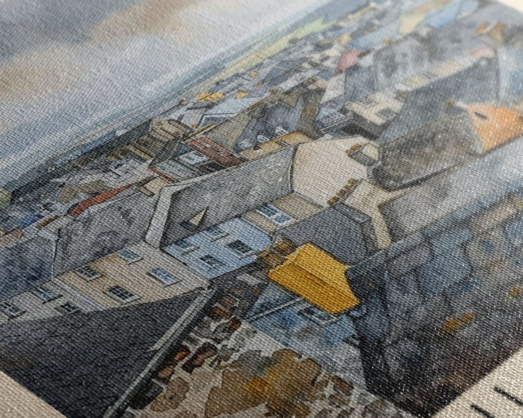 Most of our canvases are made in the USA, with the exception of canvases ordered with the light oak unstained frames, and any large canvases (24x48, 30x60, 16x48 and 20x60) ordered WITH a frame. These are temporarily made in and shipped from Europe, while we try to find a more consistent supplier in the USA.