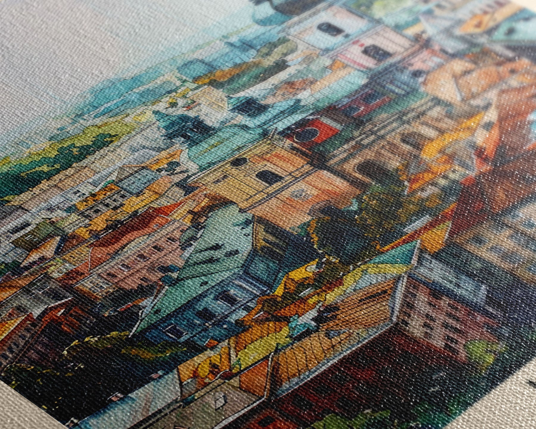 Most of our canvases are made in the USA, with the exception of canvases ordered with the light oak unstained frames, and any large canvases (24x48, 30x60, 16x48 and 20x60) ordered WITH a frame. These are temporarily made in and shipped from Europe, while we try to find a more consistent supplier in the USA.
