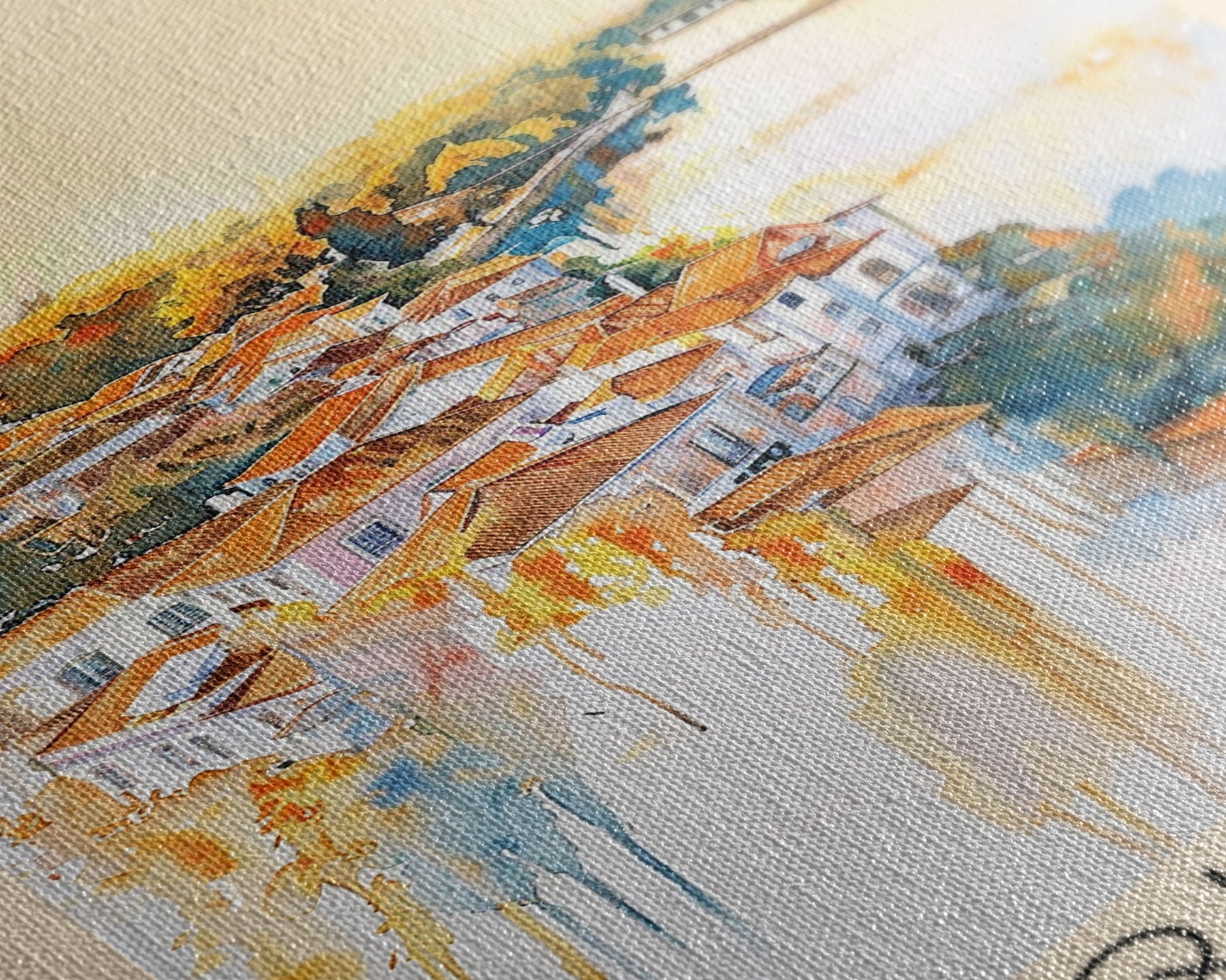 Most of our canvases are made in the USA, with the exception of canvases ordered with the light oak unstained frames, and any large canvases (24x48, 30x60, 16x48 and 20x60) ordered WITH a frame. These are temporarily made in and shipped from Europe, while we try to find a more consistent supplier in the USA.
