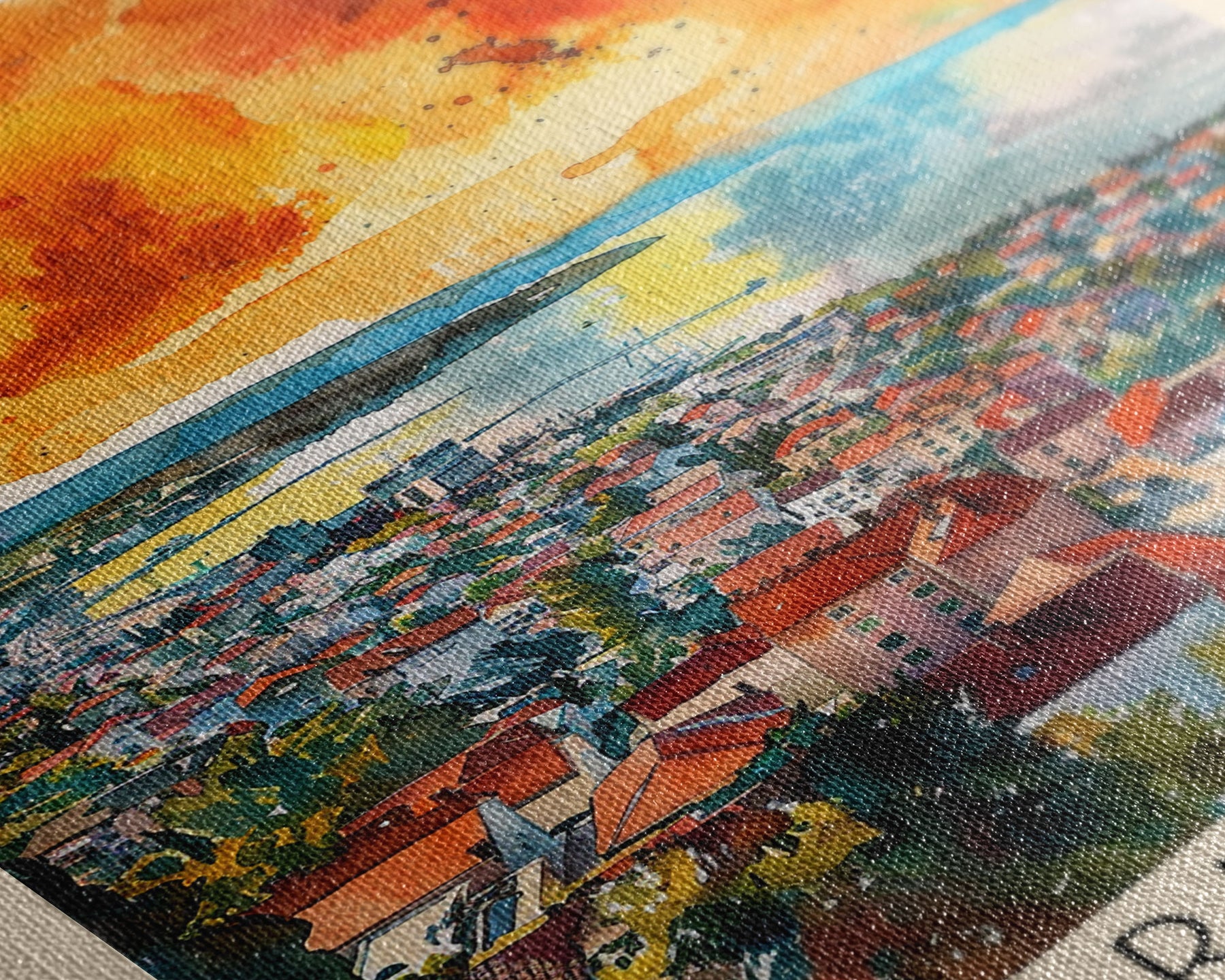 Most of our canvases are made in the USA, with the exception of canvases ordered with the light oak unstained frames, and any large canvases (24x48, 30x60, 16x48 and 20x60) ordered WITH a frame. These are temporarily made in and shipped from Europe, while we try to find a more consistent supplier in the USA.