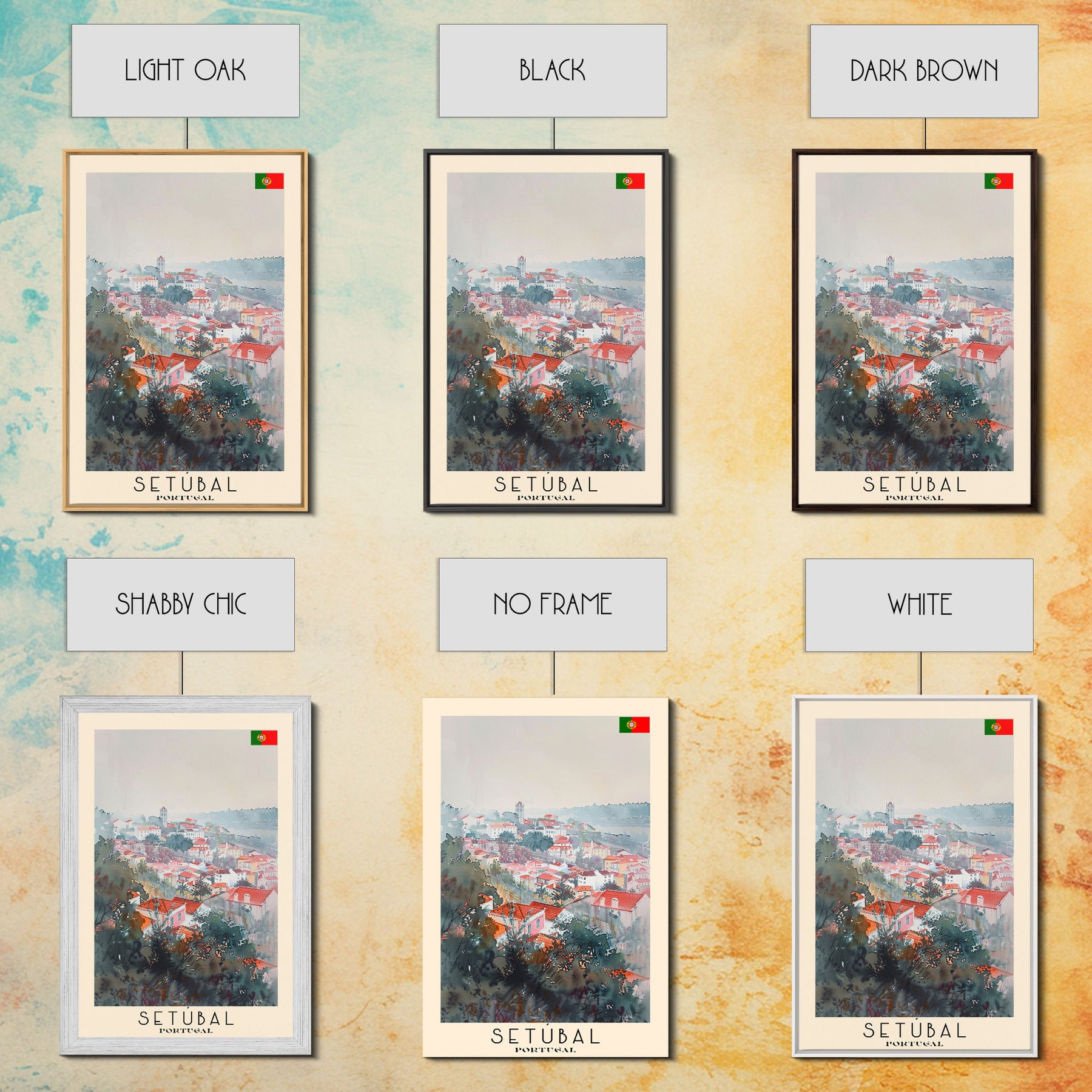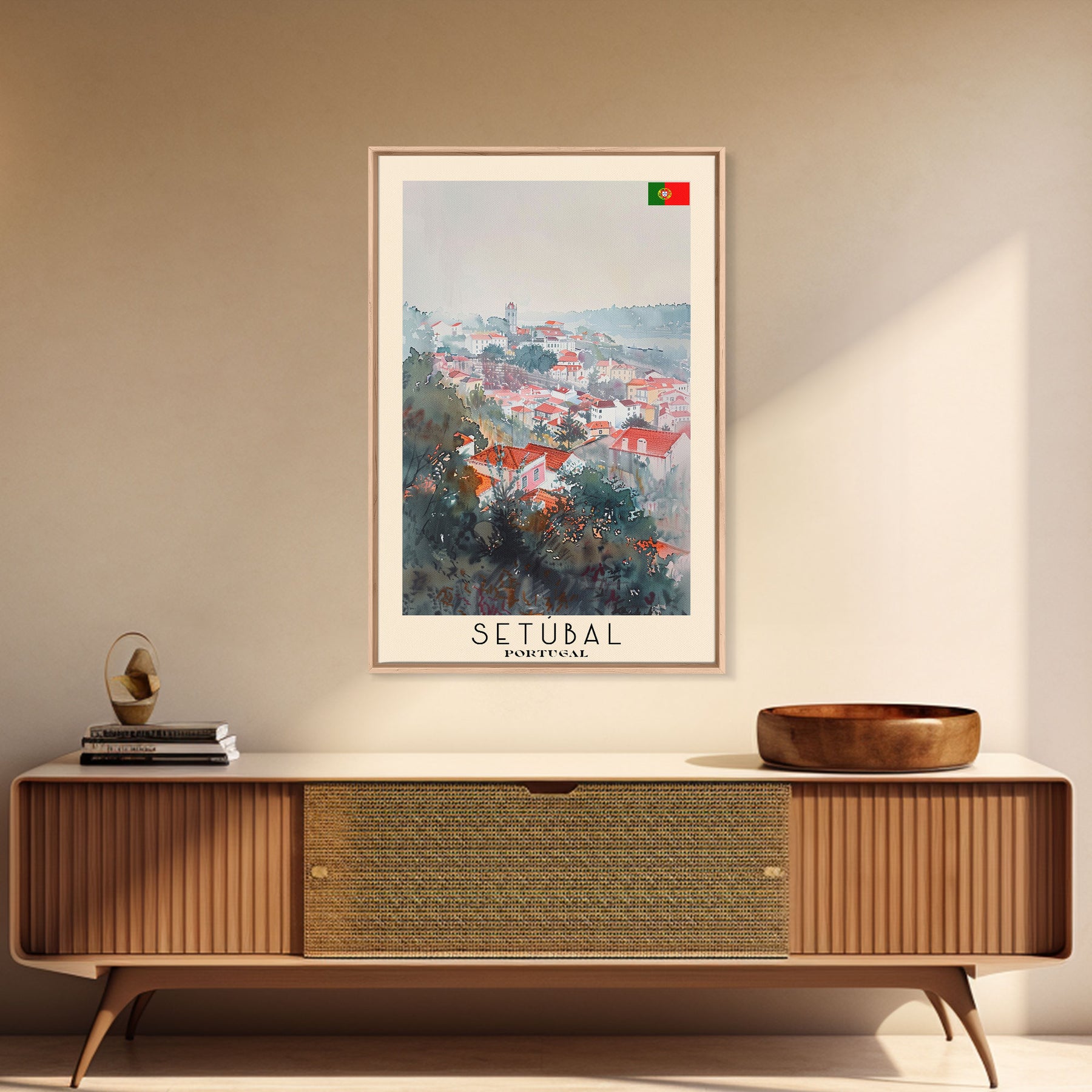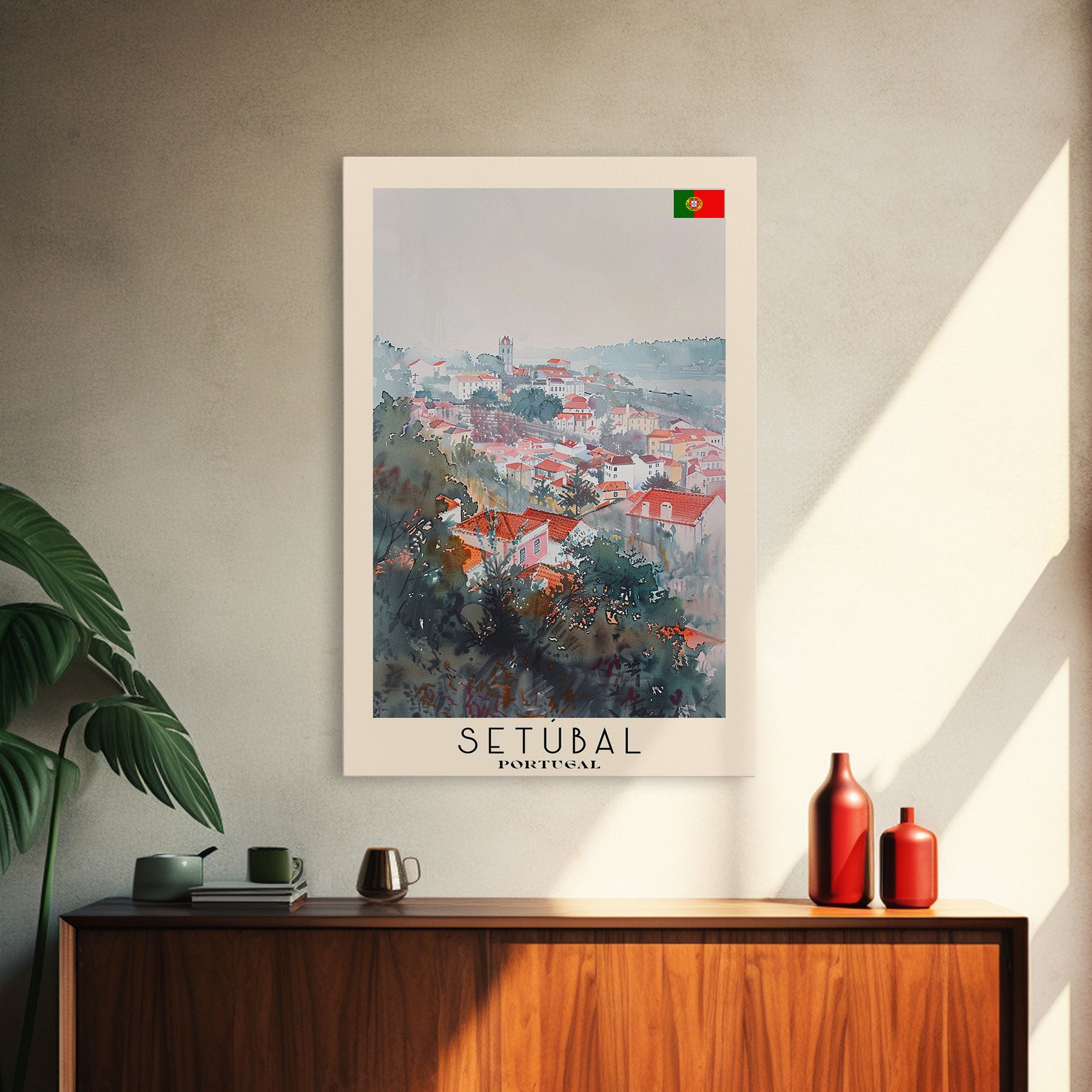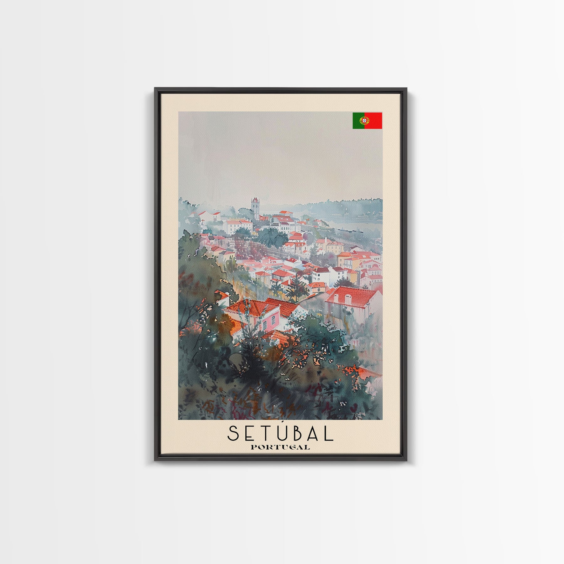 Setubal Portugal Travel Poster Framed Canvas Print, Watercolor Painting, Coastal Wall Art, Home Decor, Portuguese Seaside, Artistic Art