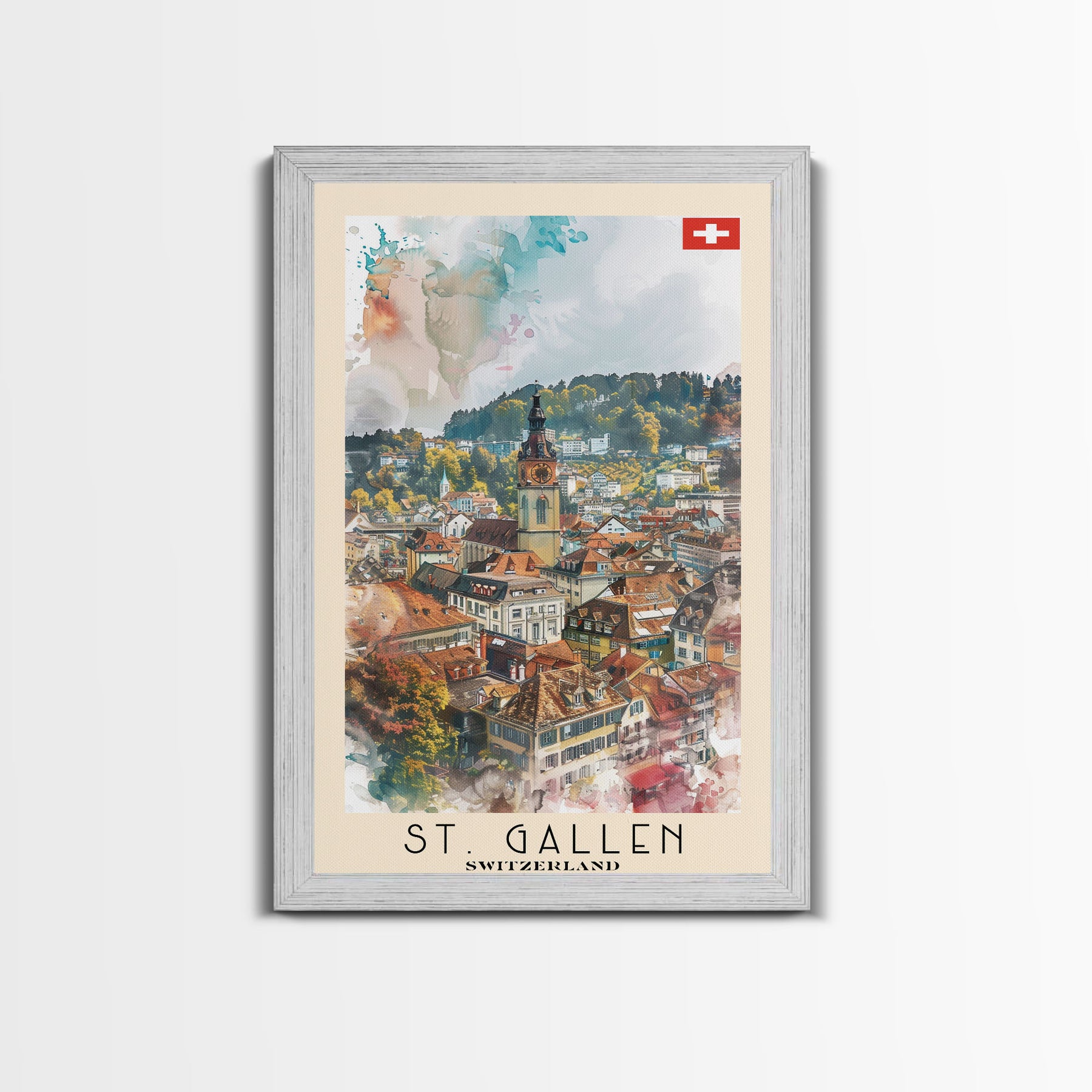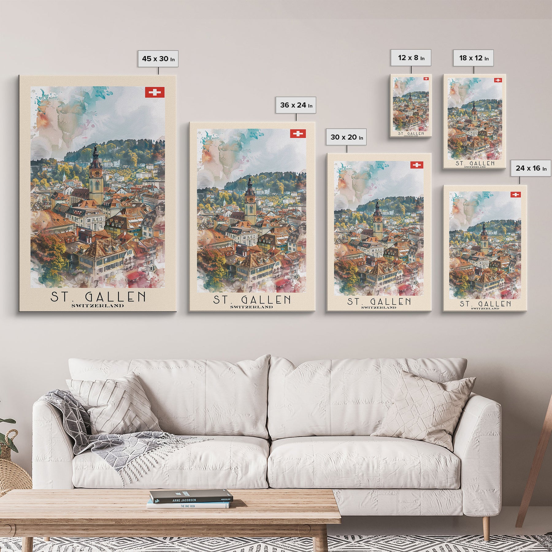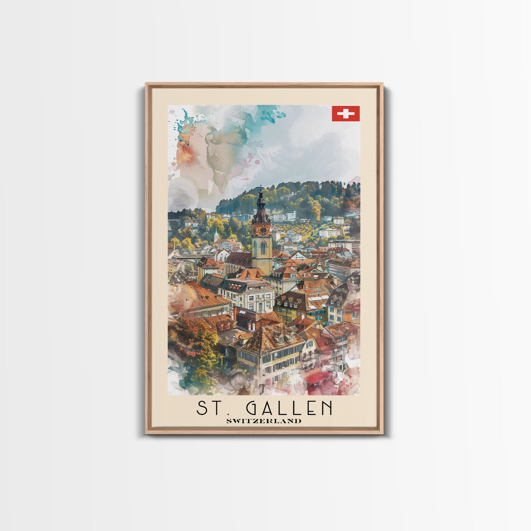 St Gallen Switzerland Travel Poster Framed Canvas Print, Watercolor Painting, Scenic Wall Art, Home Decor, Swiss Landscape, Classic Art