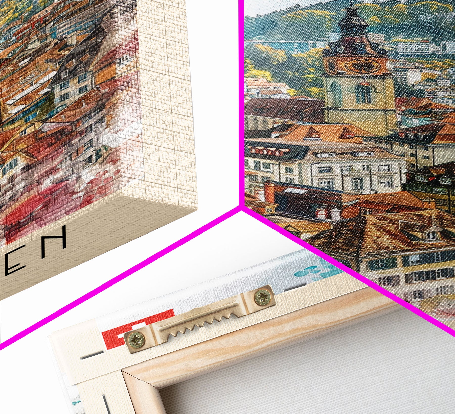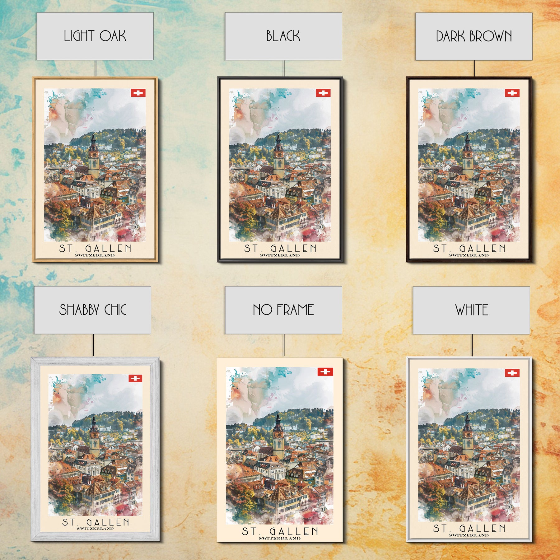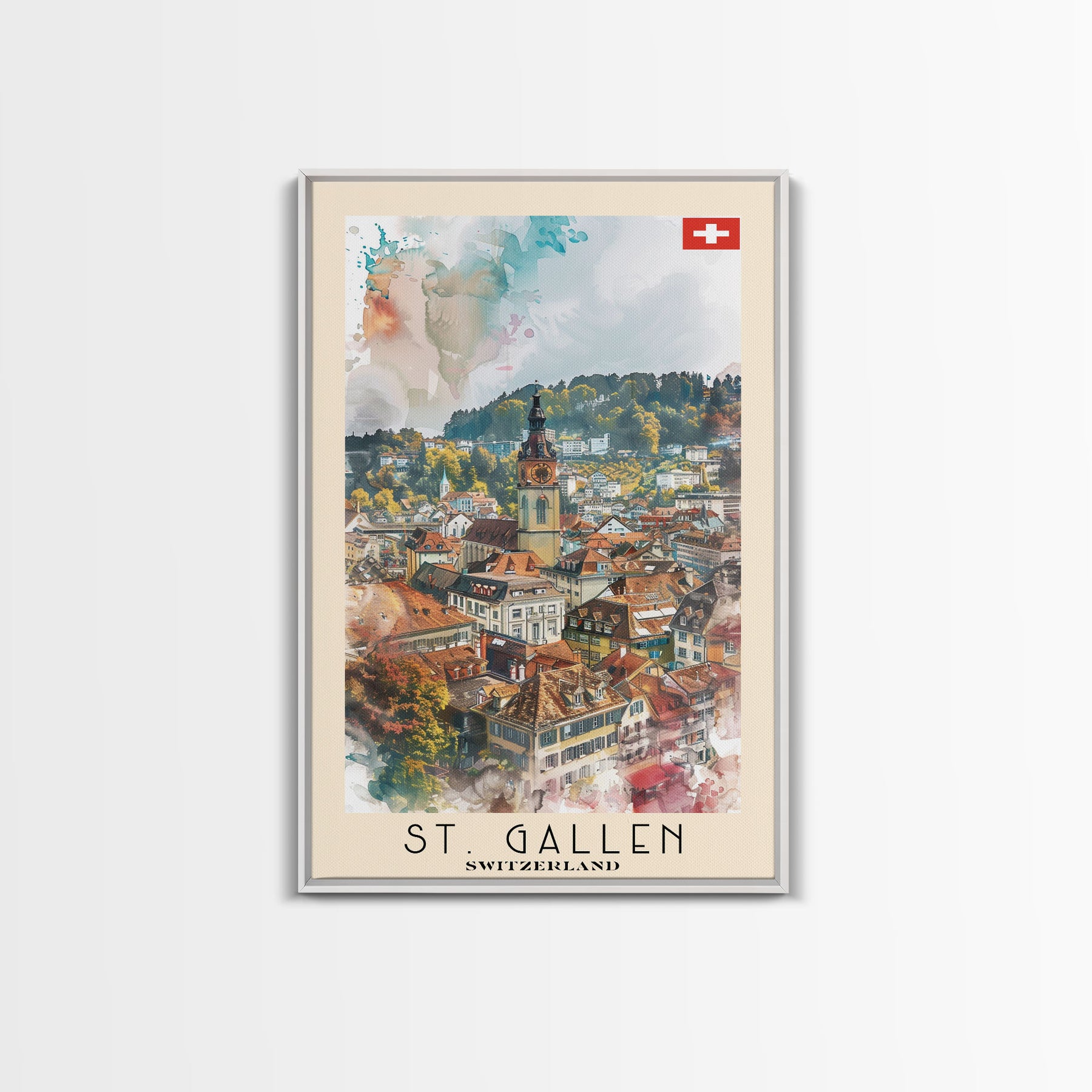 St Gallen Switzerland Travel Poster Framed Canvas Print, Watercolor Painting, Scenic Wall Art, Home Decor, Swiss Landscape, Classic Art