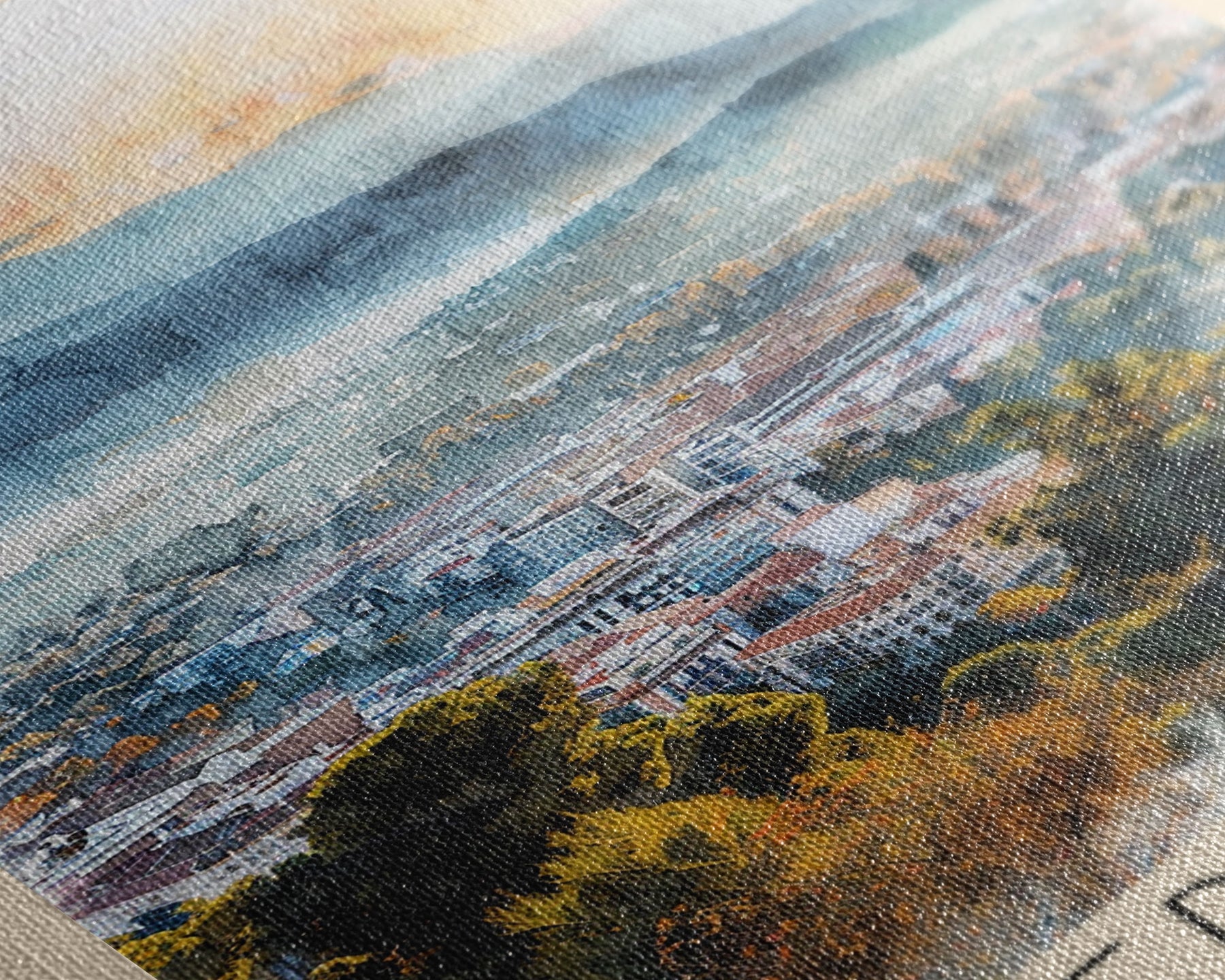 Most of our canvases are made in the USA, with the exception of canvases ordered with the light oak unstained frames, and any large canvases (24x48, 30x60, 16x48 and 20x60) ordered WITH a frame. These are temporarily made in and shipped from Europe, while we try to find a more consistent supplier in the USA.