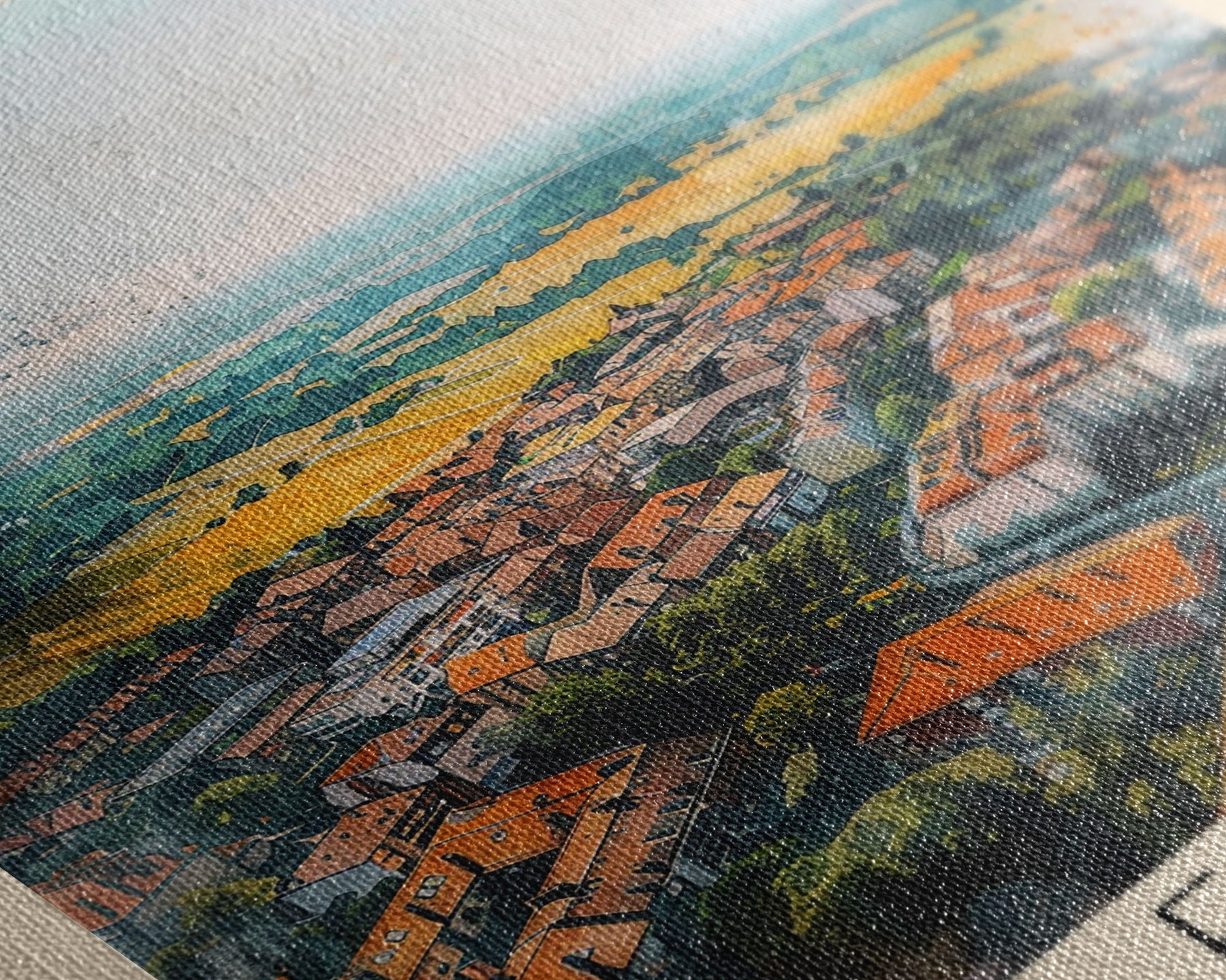 Most of our canvases are made in the USA, with the exception of canvases ordered with the light oak unstained frames, and any large canvases (24x48, 30x60, 16x48 and 20x60) ordered WITH a frame. These are temporarily made in and shipped from Europe, while we try to find a more consistent supplier in the USA.