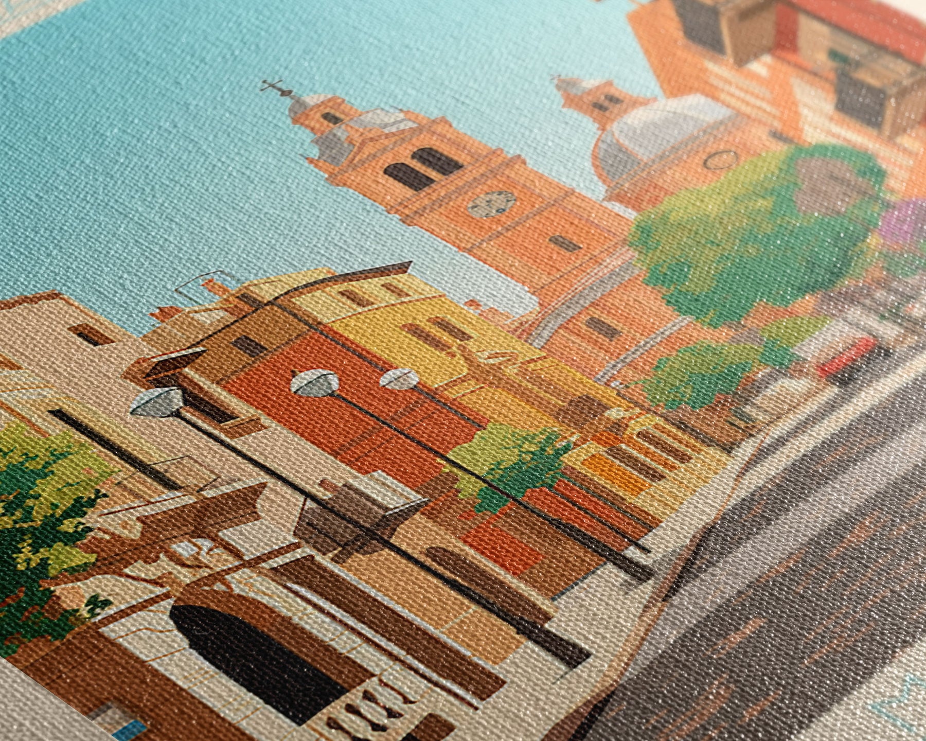 Alcalá de Henares Spain Travel Poster Framed Canvas Print, Midcentury Modern Art, Pop Art Decor, Wall Art, Vacation Gift, Living Room Decoration, Scenic Print