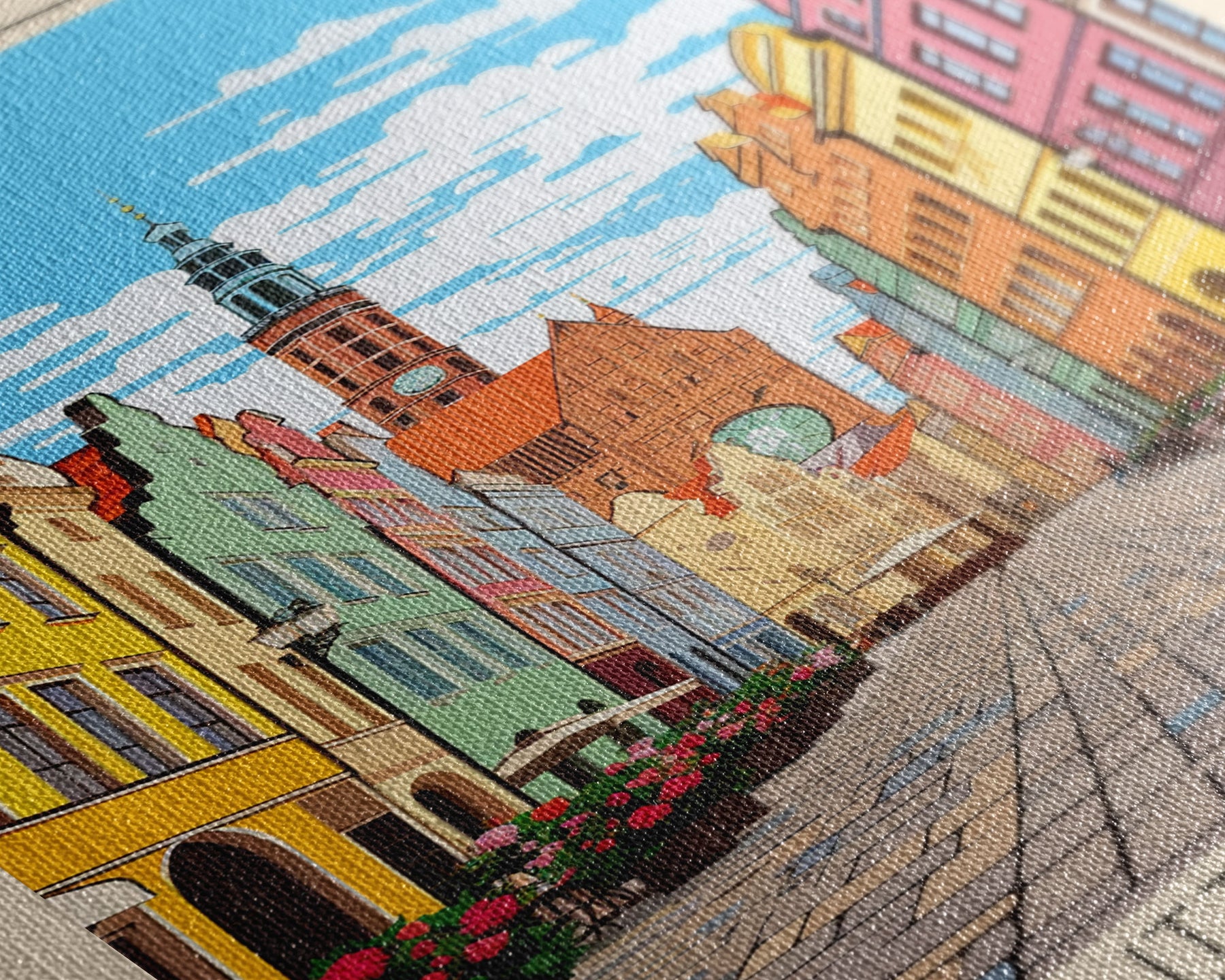 Most of our canvases are made in the USA, with the exception of canvases ordered with the light oak unstained frames, and any large canvases (24x48, 30x60, 16x48 and 20x60) ordered WITH a frame. These are temporarily made in and shipped from Europe, while we try to find a more consistent supplier in the USA.