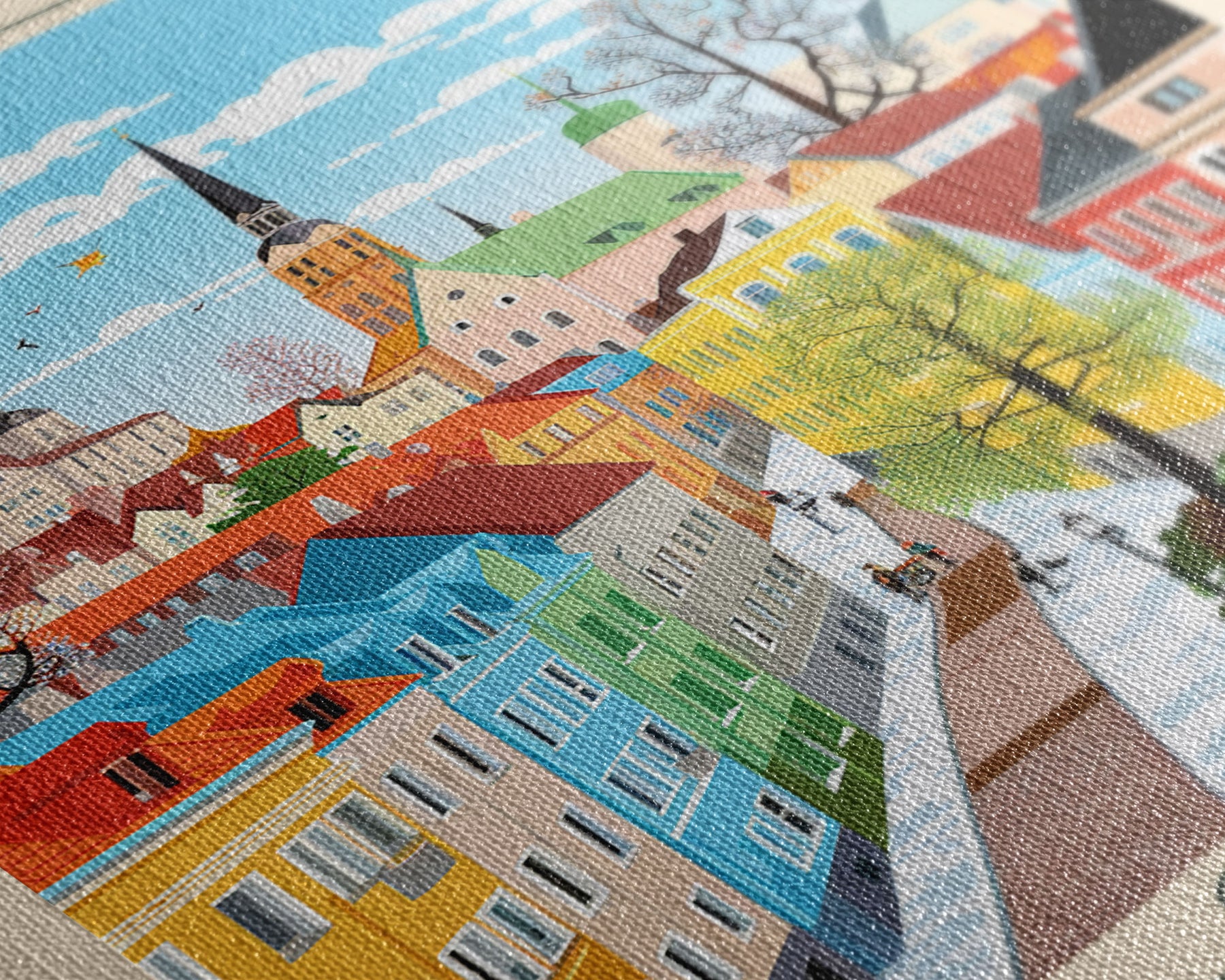 Most of our canvases are made in the USA, with the exception of canvases ordered with the light oak unstained frames, and any large canvases (24x48, 30x60, 16x48 and 20x60) ordered WITH a frame. These are temporarily made in and shipped from Europe, while we try to find a more consistent supplier in the USA.