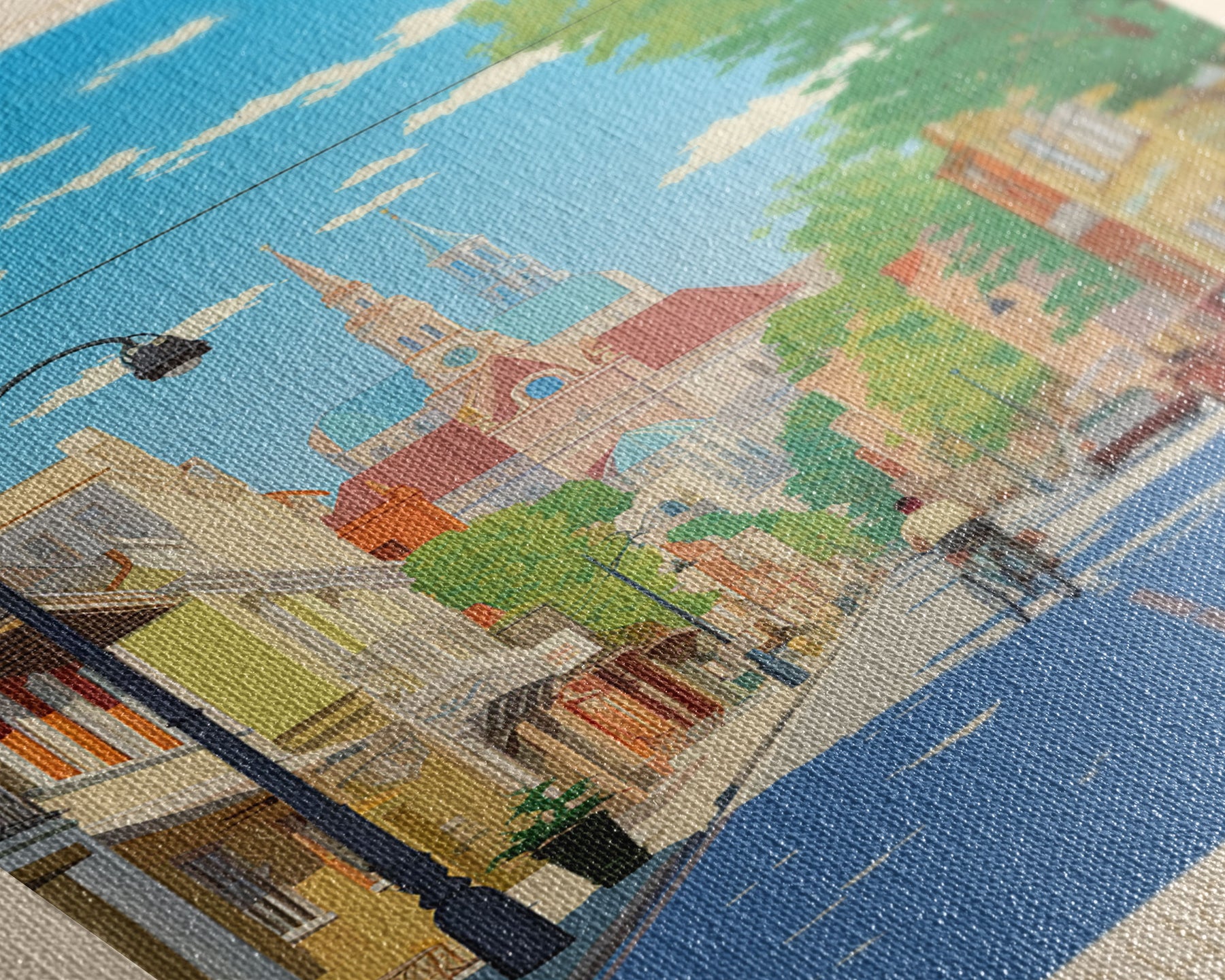 Most of our canvases are made in the USA, with the exception of canvases ordered with the light oak unstained frames, and any large canvases (24x48, 30x60, 16x48 and 20x60) ordered WITH a frame. These are temporarily made in and shipped from Europe, while we try to find a more consistent supplier in the USA.
