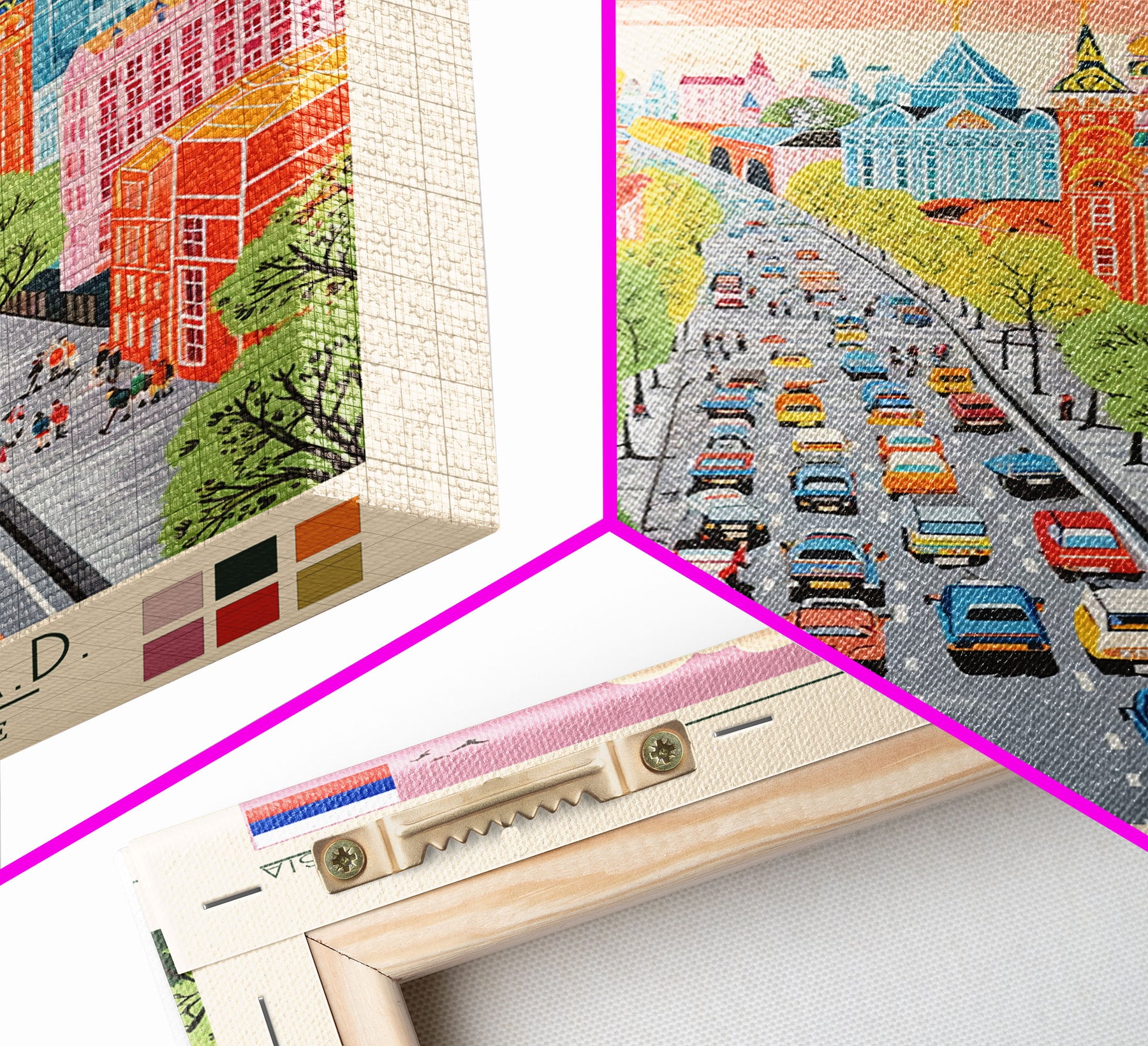 Hello and thank you for taking the time to view our modern high quality giclée artwork! We offer both posters and stretched canvas prints. Our posters are printed on Ultra Matte 60 lb / 230 GSM high quality photo paper, with a thickness of 10 mil. Our canvases are printed on museum grade 350 GSM canvas material with ECO friendly archival grade ink, then hand stretched and stapled over premium, FSC certified and shrink resistant frames. Designed and built to last a lifetime.