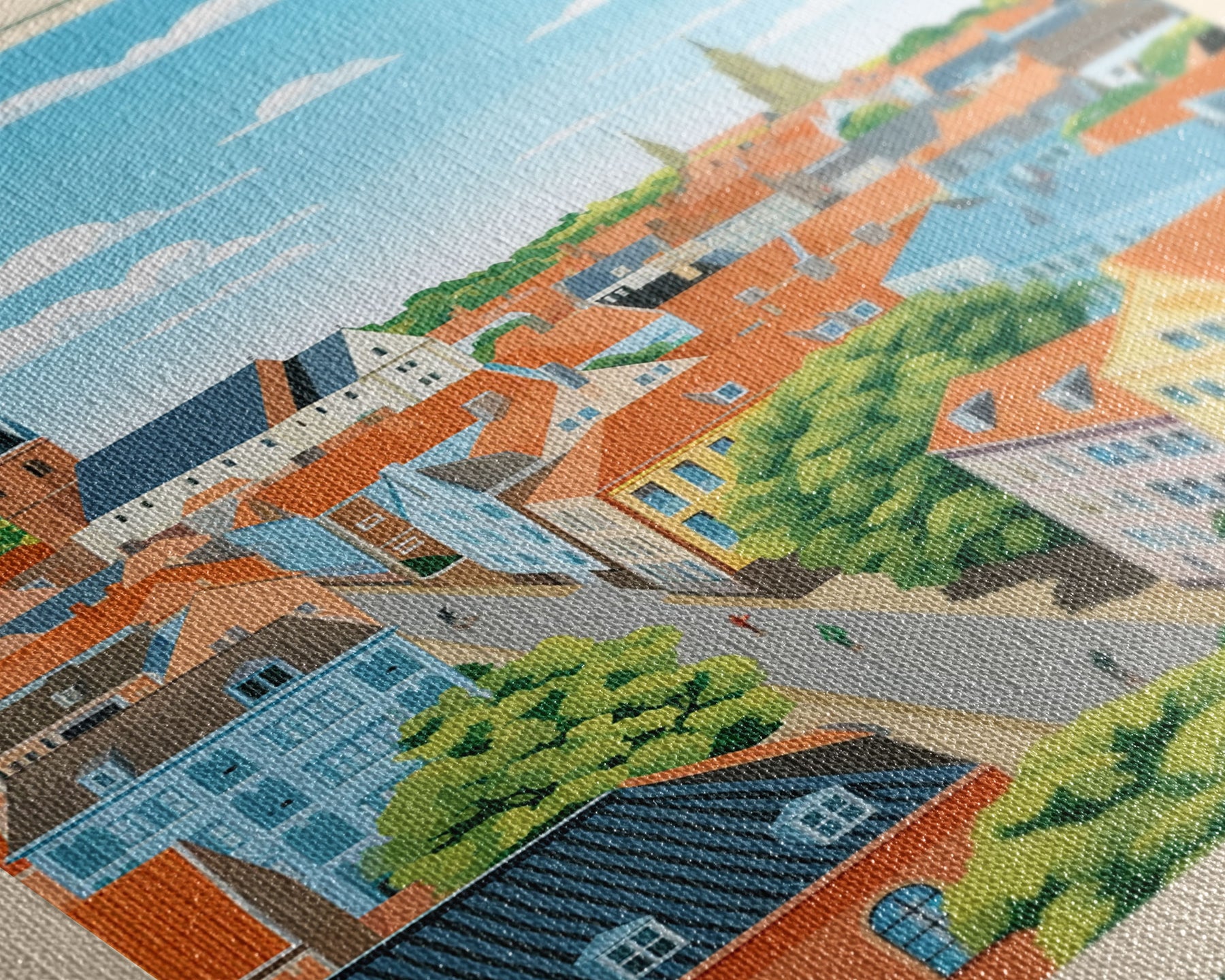 Most of our canvases are made in the USA, with the exception of canvases ordered with the light oak unstained frames, and any large canvases (24x48, 30x60, 16x48 and 20x60) ordered WITH a frame. These are temporarily made in and shipped from Europe, while we try to find a more consistent supplier in the USA.