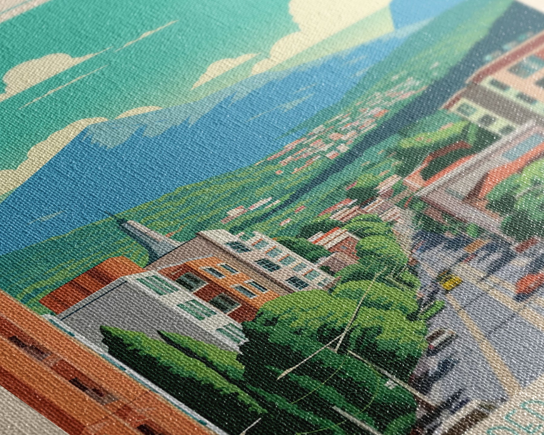 Most of our canvases are made in the USA, with the exception of canvases ordered with the light oak unstained frames, and any large canvases (24x48, 30x60, 16x48 and 20x60) ordered WITH a frame. These are temporarily made in and shipped from Europe, while we try to find a more consistent supplier in the USA.