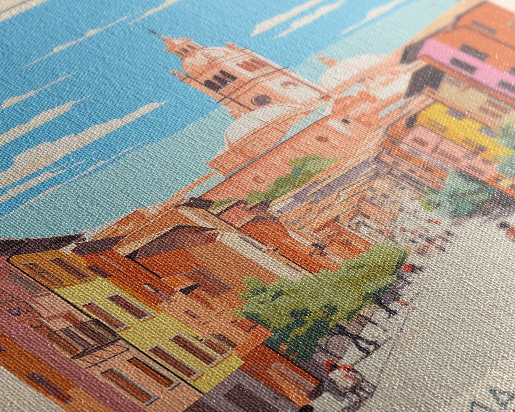 Most of our canvases are made in the USA, with the exception of canvases ordered with the light oak unstained frames, and any large canvases (24x48, 30x60, 16x48 and 20x60) ordered WITH a frame. These are temporarily made in and shipped from Europe, while we try to find a more consistent supplier in the USA.