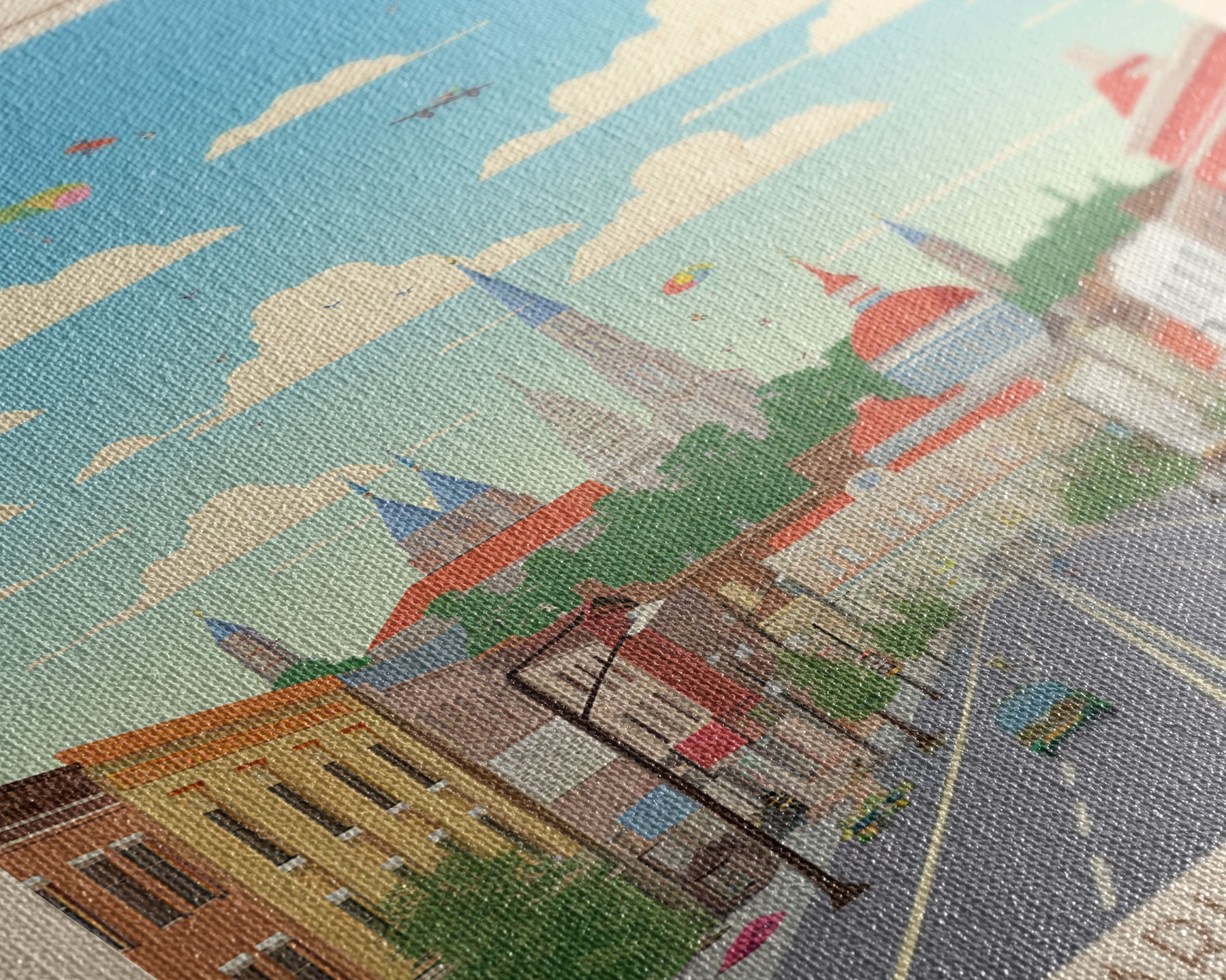 Most of our canvases are made in the USA, with the exception of canvases ordered with the light oak unstained frames, and any large canvases (24x48, 30x60, 16x48 and 20x60) ordered WITH a frame. These are temporarily made in and shipped from Europe, while we try to find a more consistent supplier in the USA.