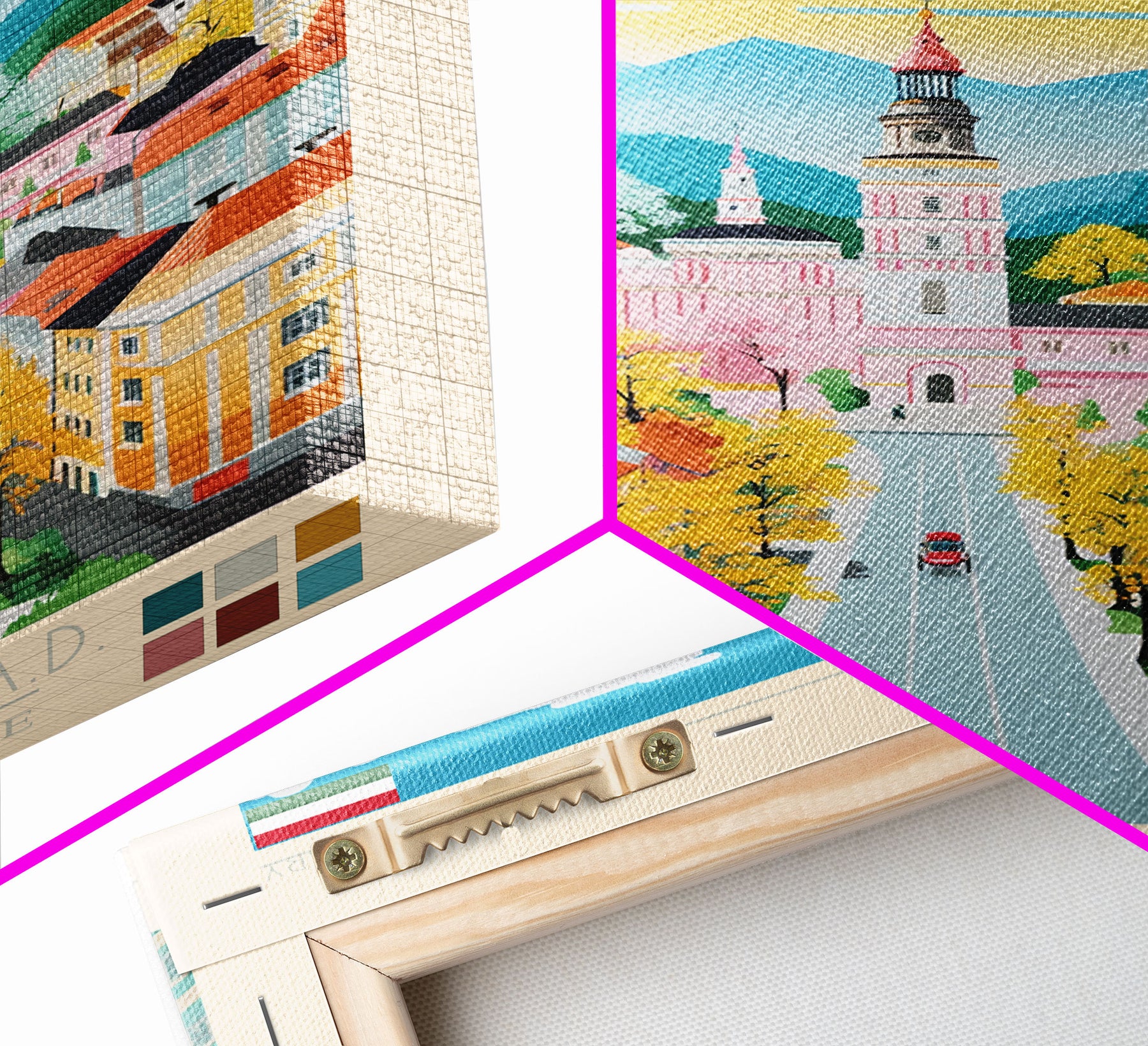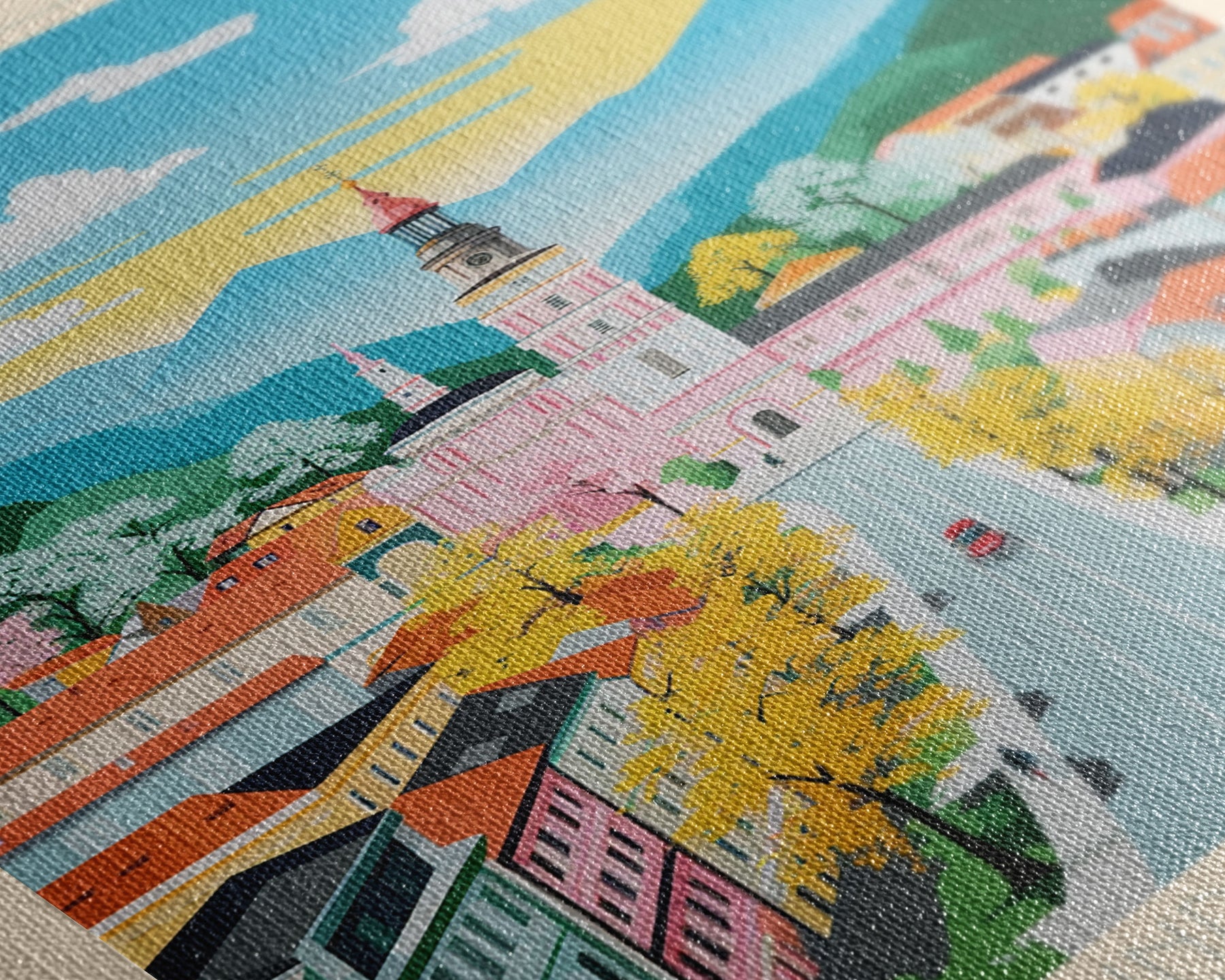 Most of our canvases are made in the USA, with the exception of canvases ordered with the light oak unstained frames, and any large canvases (24x48, 30x60, 16x48 and 20x60) ordered WITH a frame. These are temporarily made in and shipped from Europe, while we try to find a more consistent supplier in the USA.