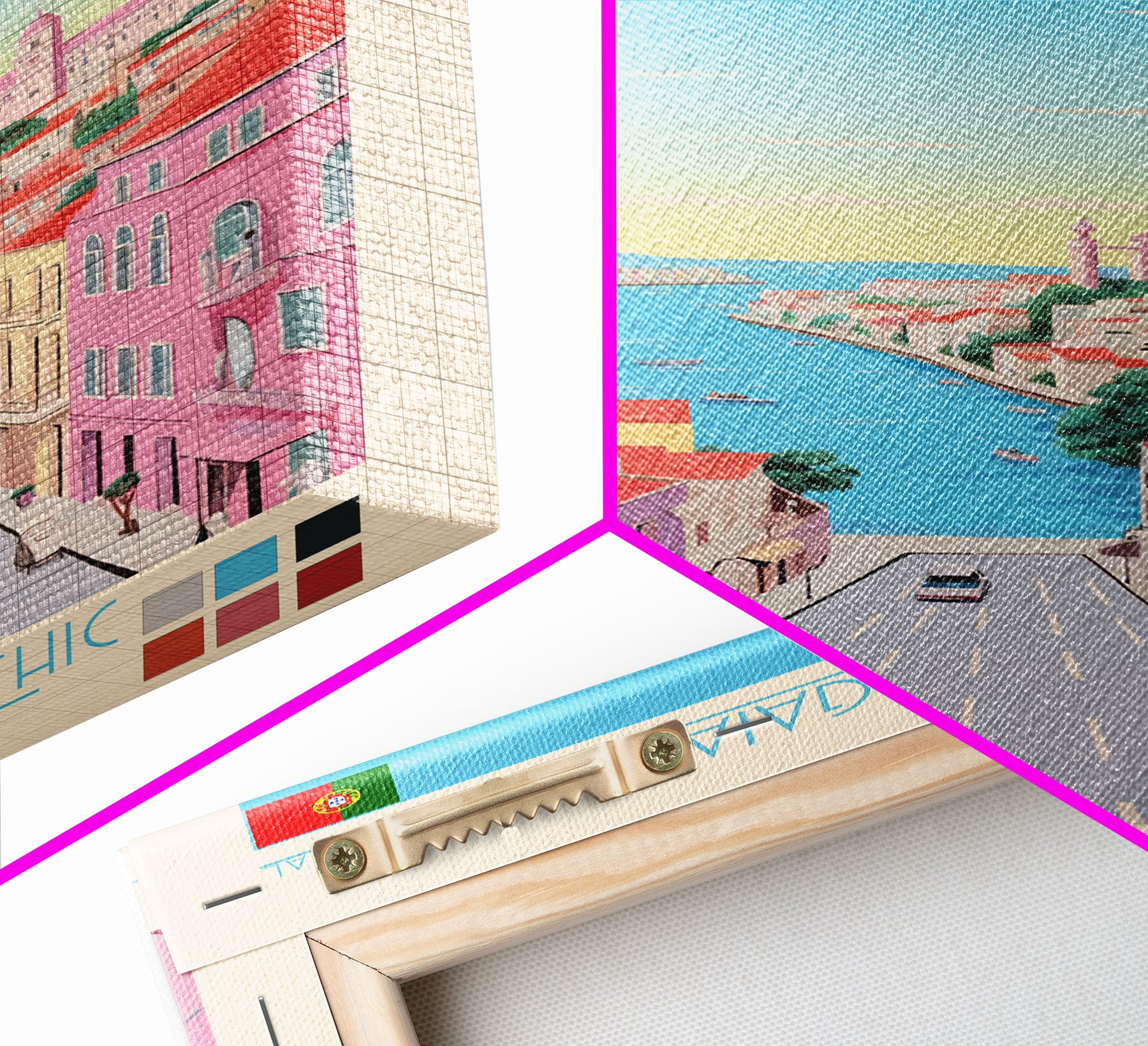 Most of our canvases are made in the USA, with the exception of canvases ordered with the light oak unstained frames, and any large canvases (24x48, 30x60, 16x48 and 20x60) ordered WITH a frame. These are temporarily made in and shipped from Europe, while we try to find a more consistent supplier in the USA.