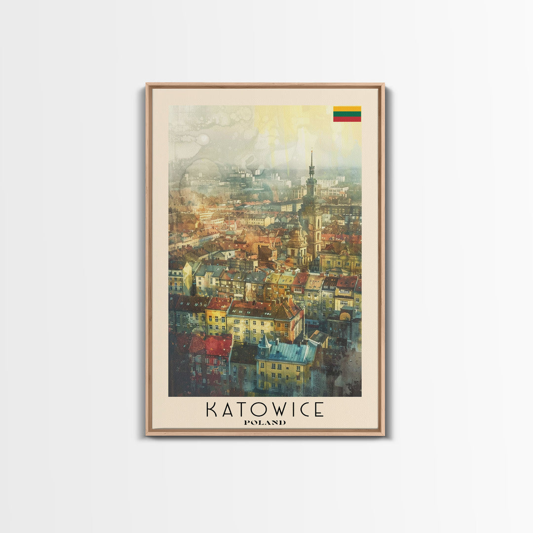 Katowice Poland Travel Poster Framed Canvas Print, Midcentury Modern Art, Pop Art Wall Decor, Home Decor, Vacation Gift, Office Art