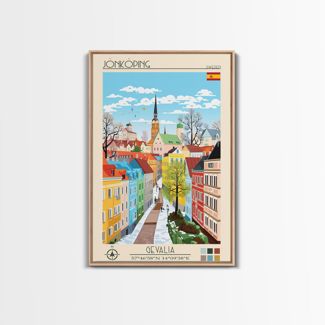 Jönköping Sweden Travel Poster Framed Canvas Print, Midcentury Modern Art, Pop Art Wall Decor, Home Decor, Vacation Gift, Office Art