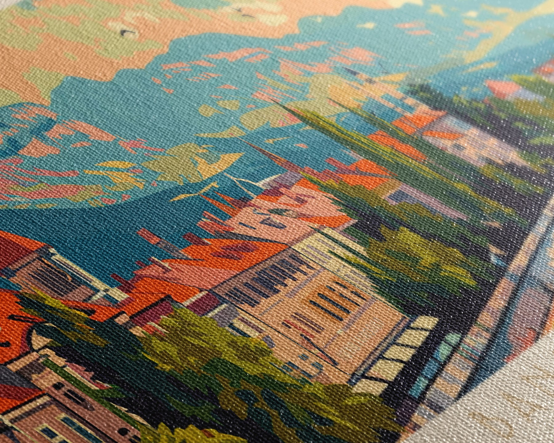 Most of our canvases are made in the USA, with the exception of canvases ordered with the light oak unstained frames, and any large canvases (24x48, 30x60, 16x48 and 20x60) ordered WITH a frame. These are temporarily made in and shipped from Europe, while we try to find a more consistent supplier in the USA.