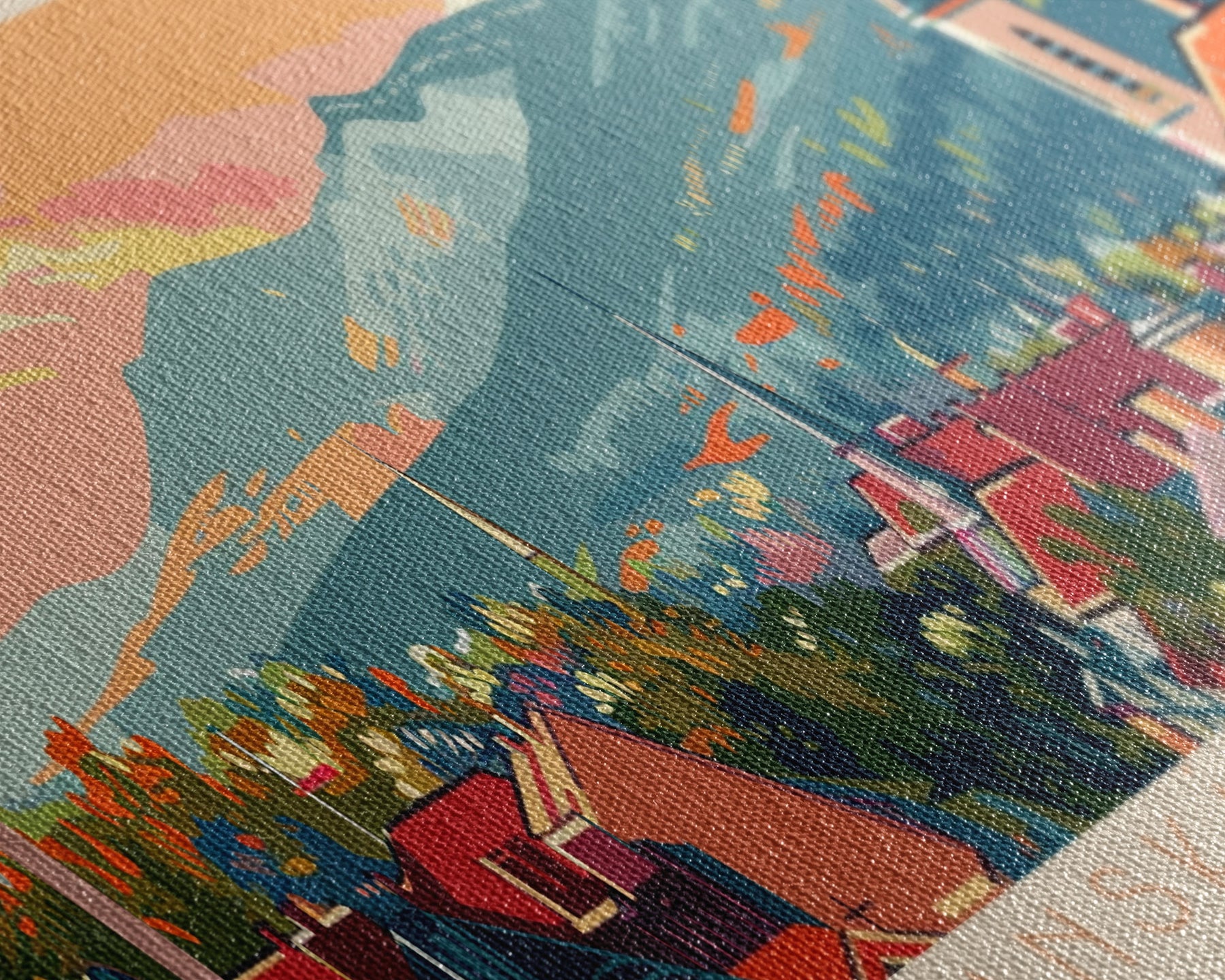 Most of our canvases are made in the USA, with the exception of canvases ordered with the light oak unstained frames, and any large canvases (24x48, 30x60, 16x48 and 20x60) ordered WITH a frame. These are temporarily made in and shipped from Europe, while we try to find a more consistent supplier in the USA.